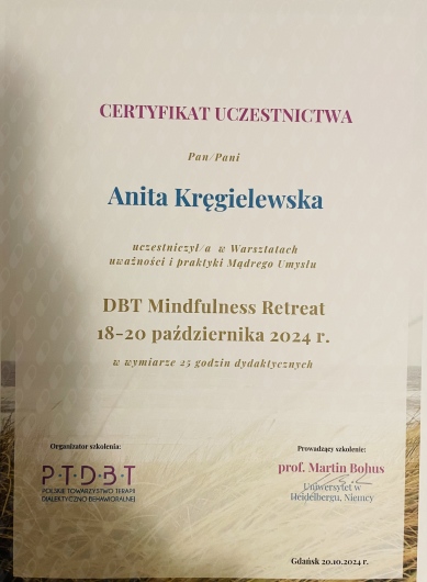 Osobiście terapia DBT jest bliska mojemu sercu nie tylko ze względu na swoją skuteczności ale i na założenia dotyczące relacji pacjent-terapeuta. Jako terapeuta jestem bardzo empatyczna, współczująca i zawsze gotowa do pomocy a zarazem wymagająca i mobilizująca moich pacjentów do pracy nad sobą.
