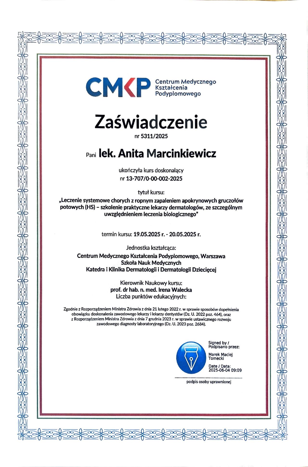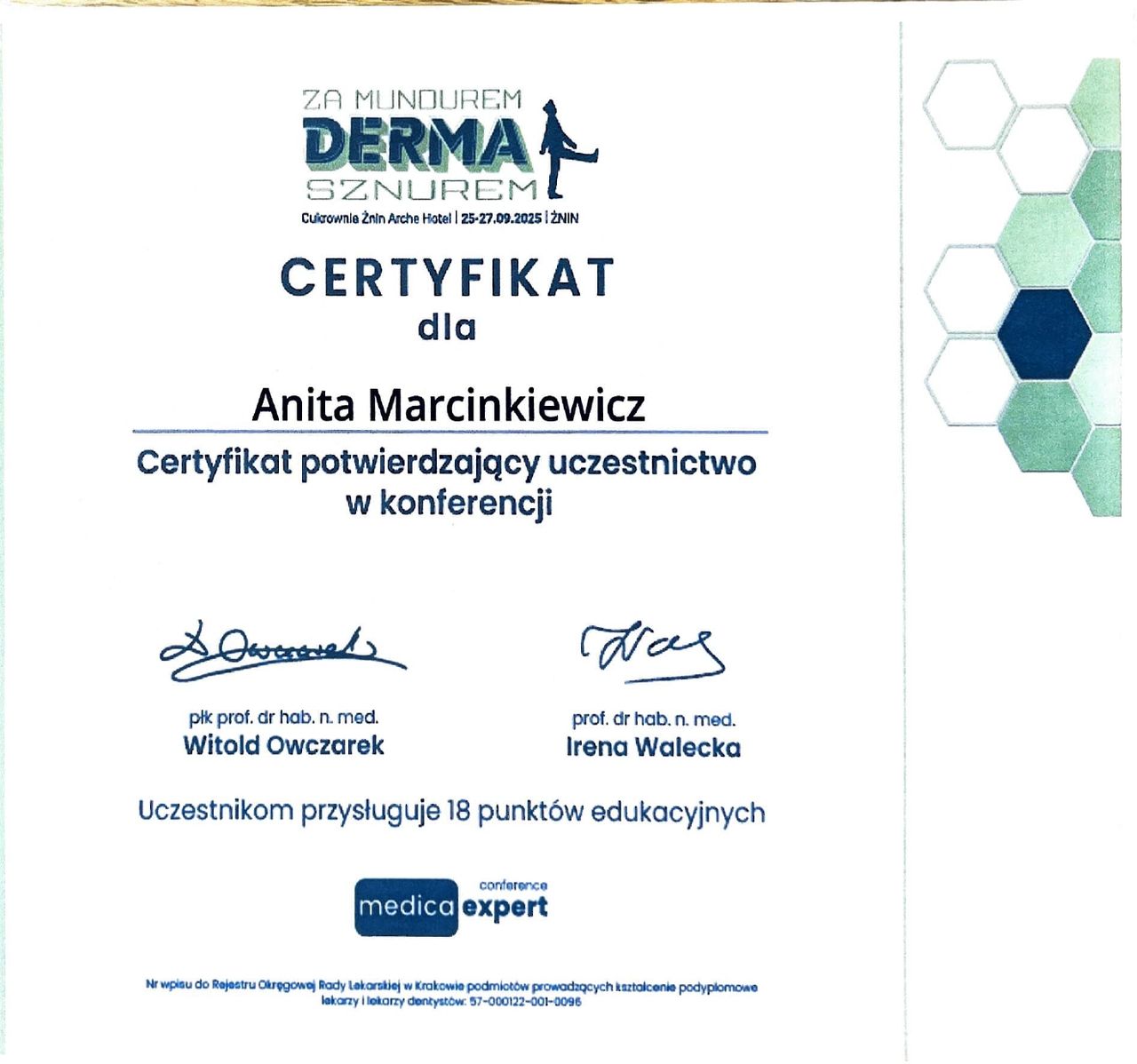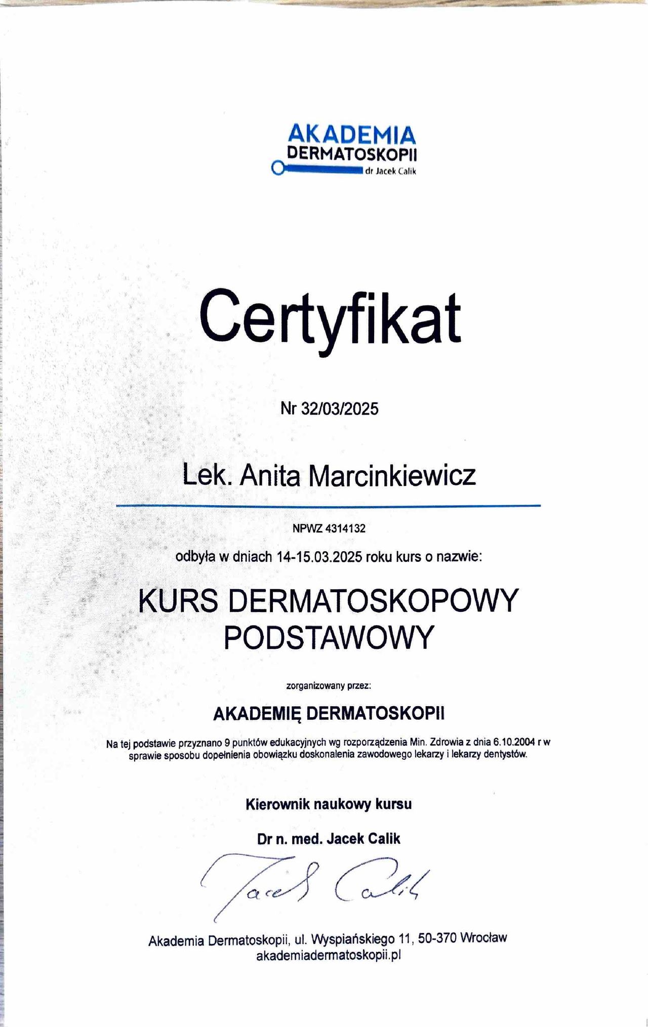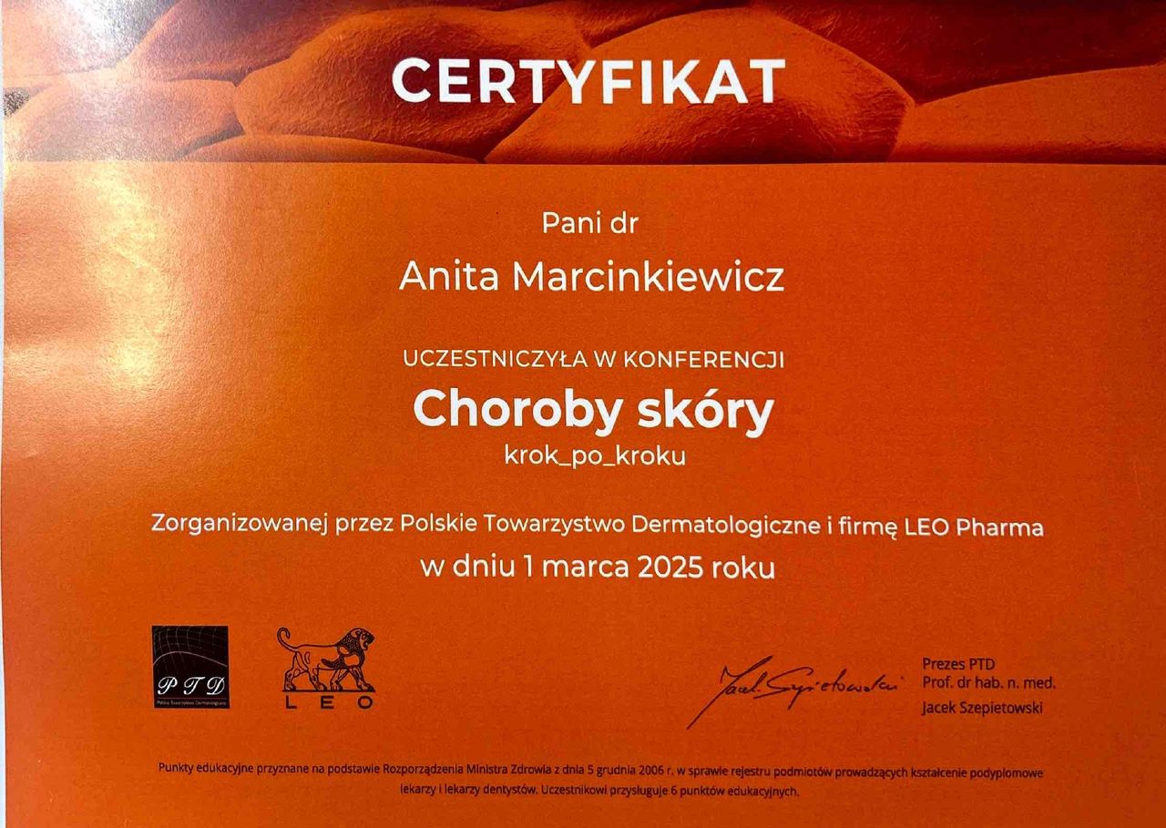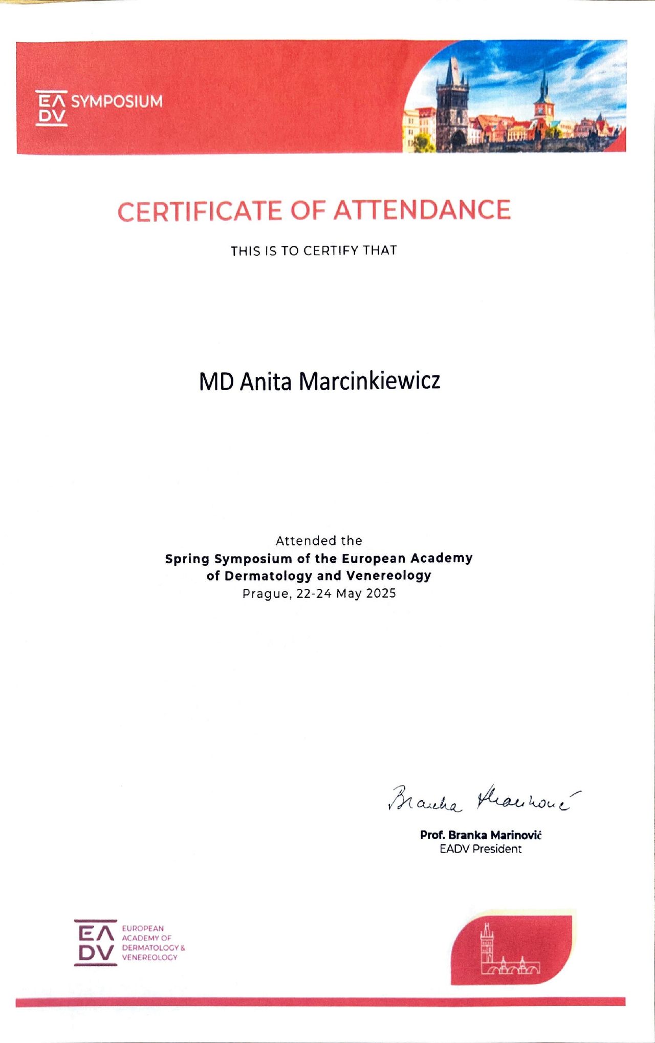 Stale poszerzam swoją wiedzę, uczestnicząc w polskich i europejskich konferencjach, kursach oraz szkoleniach z zakresu dermatologii klinicznej i estetycznej. Jestem członkiem Polskiego Towarzystwa Dermatologicznego oraz European Academy of Dermatology and Venereology (EADV).