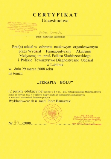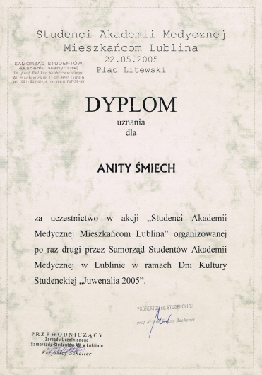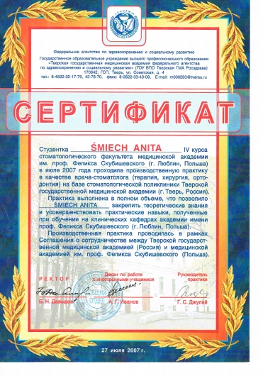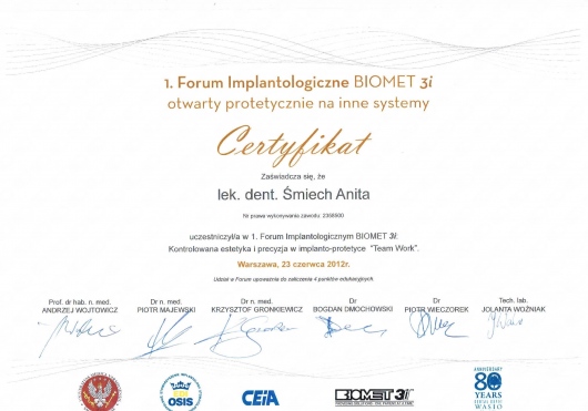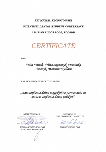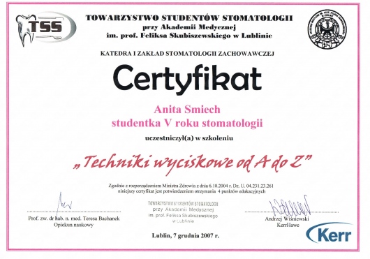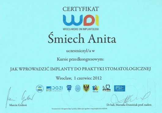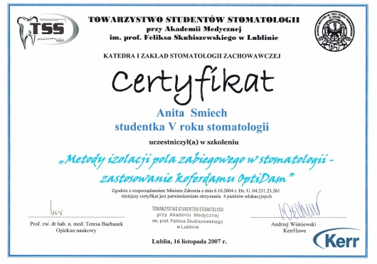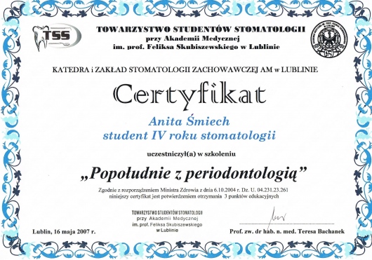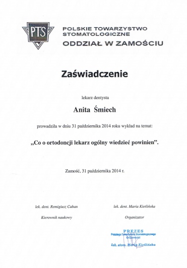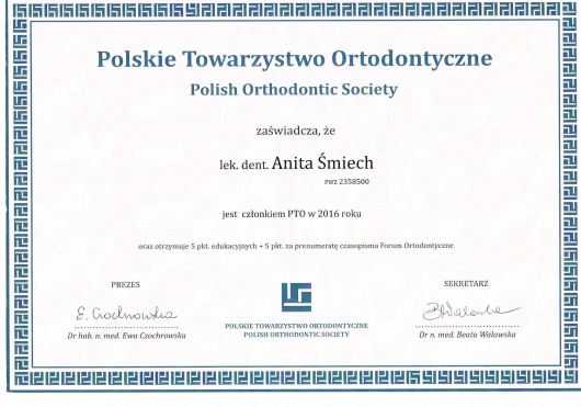 Dodatkowo jestem członkiem Polskiego Towarzystwa Ortodontycznego (PTO) oraz Polskiego Towarzystwa Stomatologicznego (PTS).
