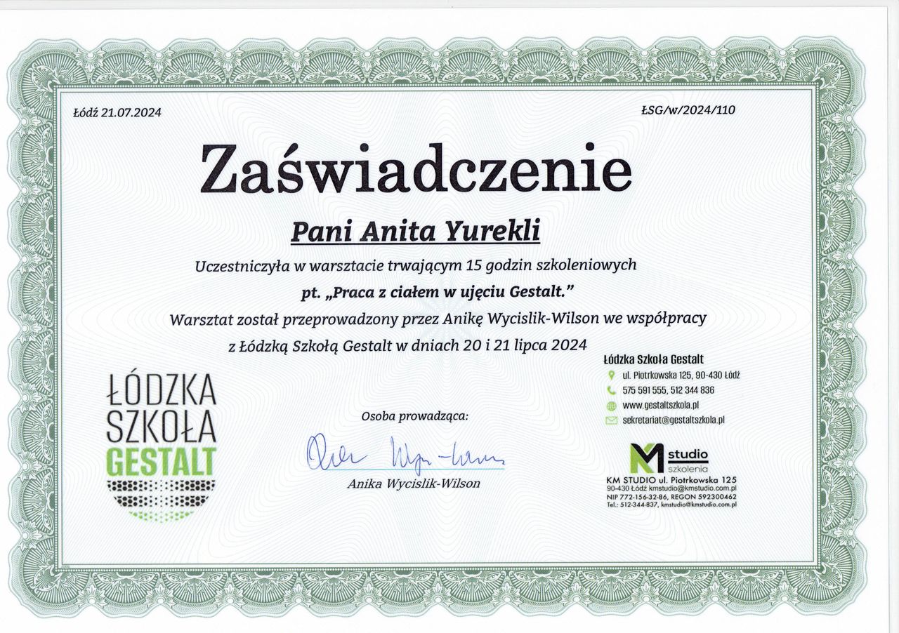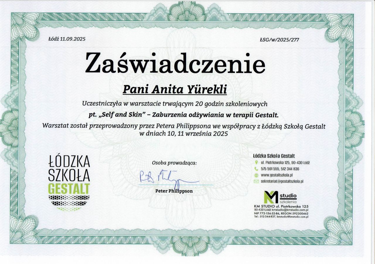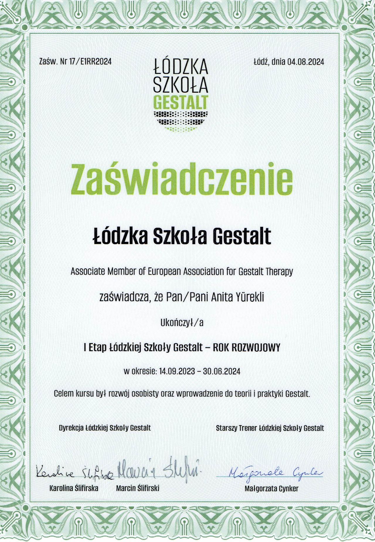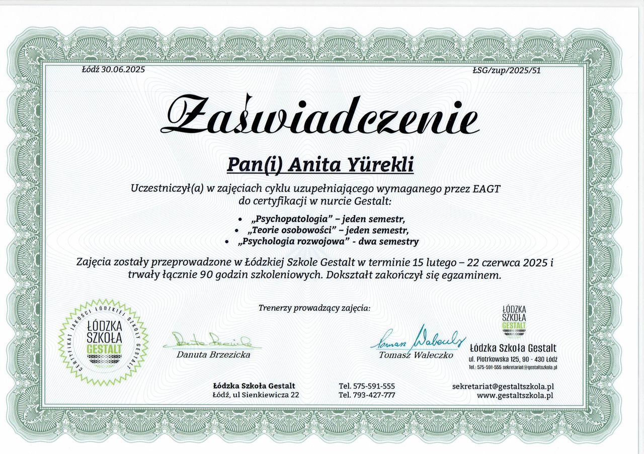Jestem terapeutką Gestalt w trakcie czteroletniego cyklu szkoleniowego dla psychoterapeutów realizowanym zgodnie z wymogami European Association for Gestalt Therapy (EAGT).