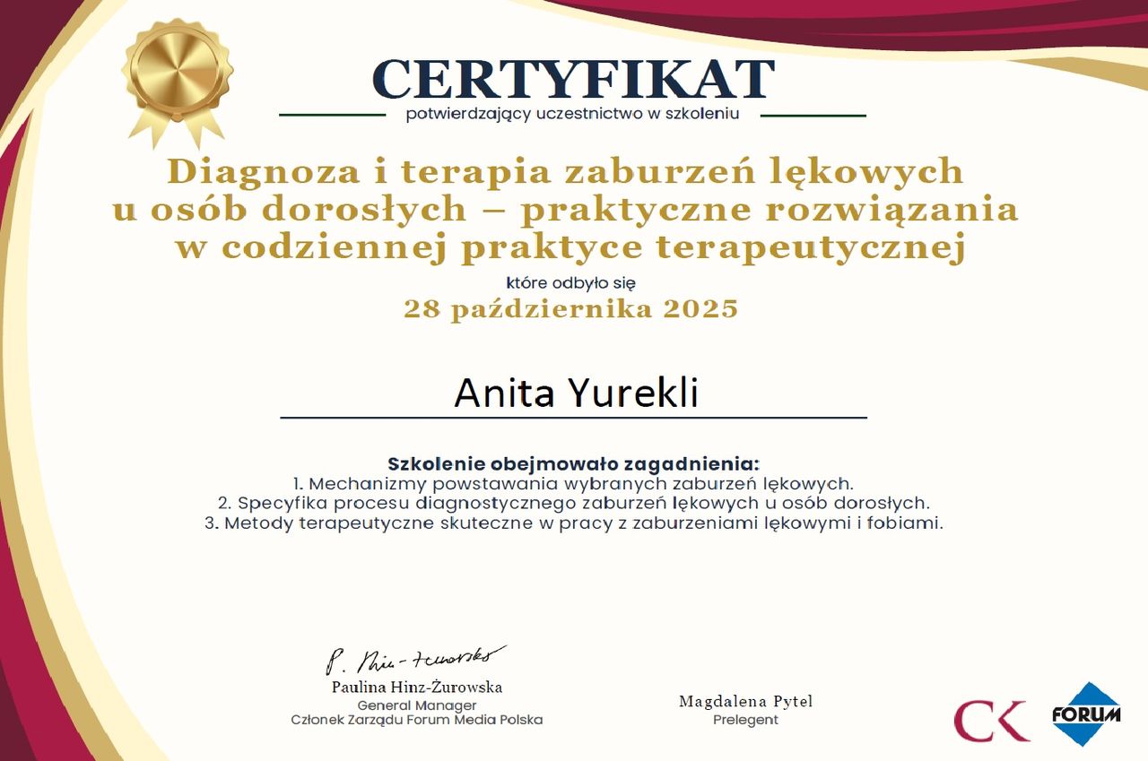 Jesteś już po wizycie u mgr Anita Yurekli? Daj znać, co myślisz. Inni pacjenci będą wdzięczni za pomoc w wyborze najlepszego specjalisty.