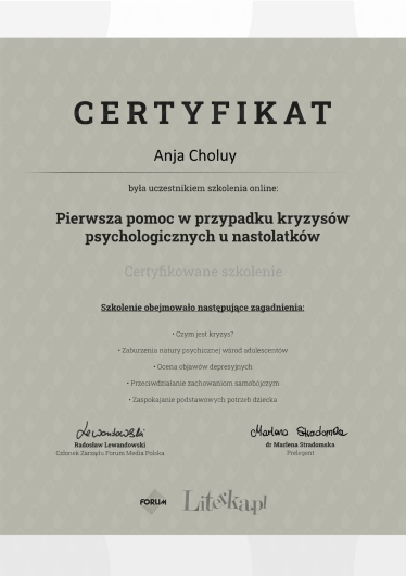 Posiadam profesjonalne przygotowanie do prowadzenia interwencji typu drugiego, diagnozy osób dotkniętych kryzysami o zróżnicowanej etiopatogenezie i symptomatologii, ze szczególnym naciskiem na kryzysy sytuacyjne spowodowane traumą.