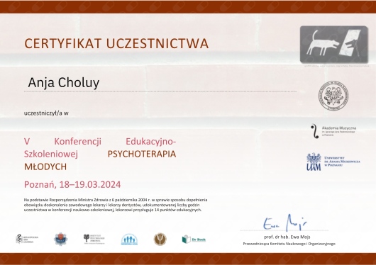 Niestety nie polecam Pani Anji Choluy. Poczatkowo wywarla na mnie dobre wrazenie - bylam ciepla I serdeczna - cieszylam sie na terapie. Po trzech sesjach gdzie ogolnie omawialysmy problem, zaproponowala mi konkretna metode terapeutyczna od nastepnego spotkania co ucieszylo mnie gdyz bylam w kryzysie. Kolejne dwa spotkania odwolala tuz przed rozpoczeciem sesji, pierwszy raz byla to choroba wiec pomyslam zdarza sie, ale tydzien pozniej byla to 'awaria w domu' pomimo tego ze dzien wczesniej upewnialam sie ze terapia sie odbedzie. W tym momencie stracilam zaufanie do niej i fakt ze nie moglam na niej polegac gdy faktycznie tak slabo sie czulam I potrzebowalam wsparcia spowodowal ze postanowilam poszukac nowego terapeuty. O zwrot pieniedzy za odwolana sesje musialam prosic wiele razy I za kazym razem nic nie przychodzilo I nie dostawalam zadnej wiadomosci w tej sprawie. Finalnie zwrot dostalam na kwote mniejsza niz ta ktora zaplacilam. Generalnie strata czasu, zdrowia I pieniedzy.