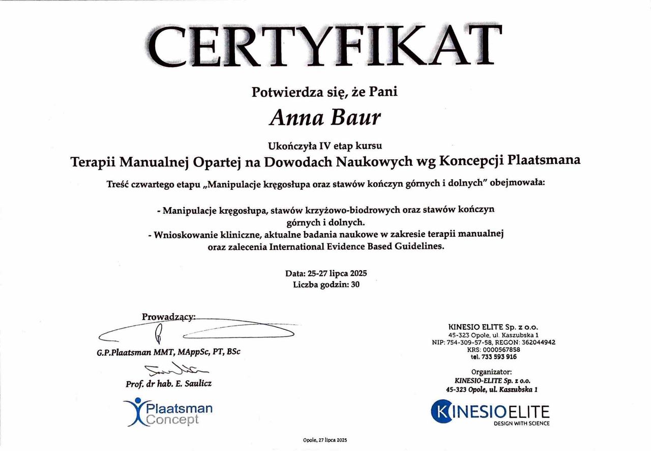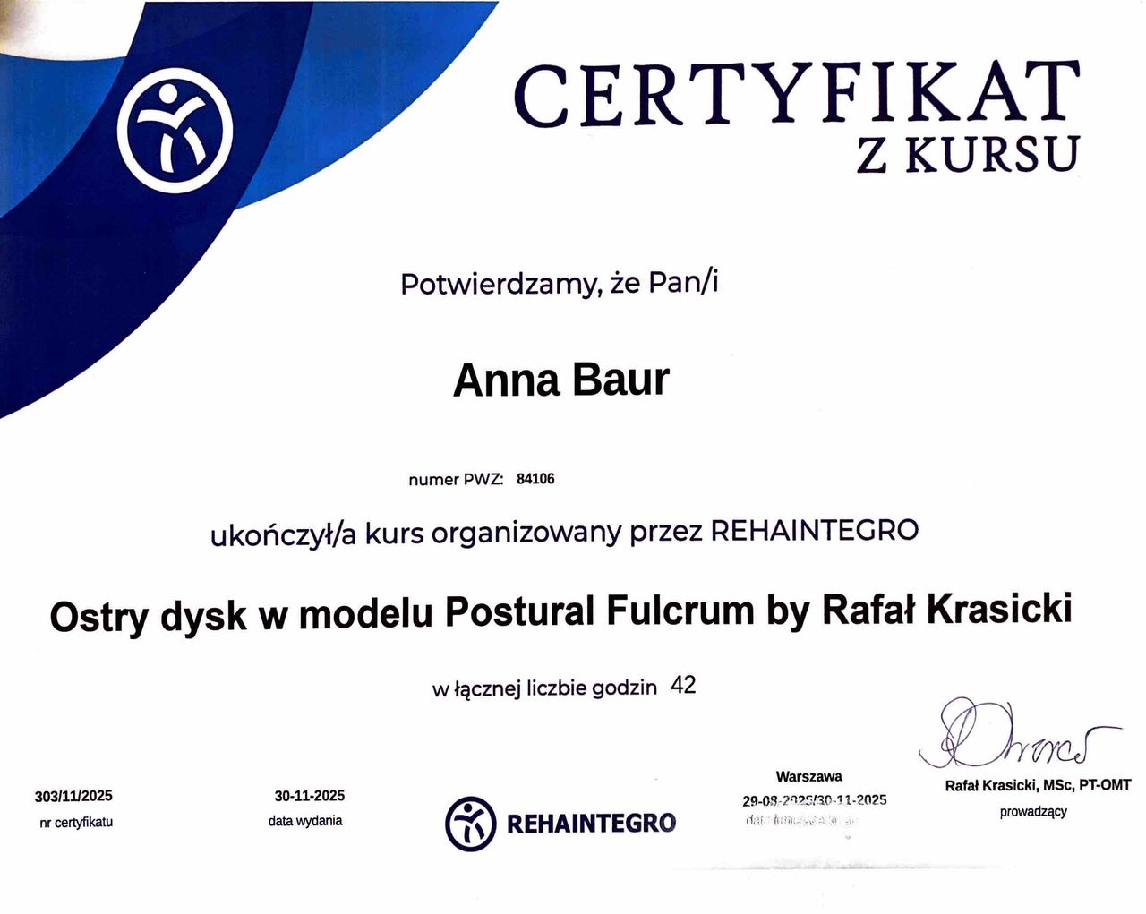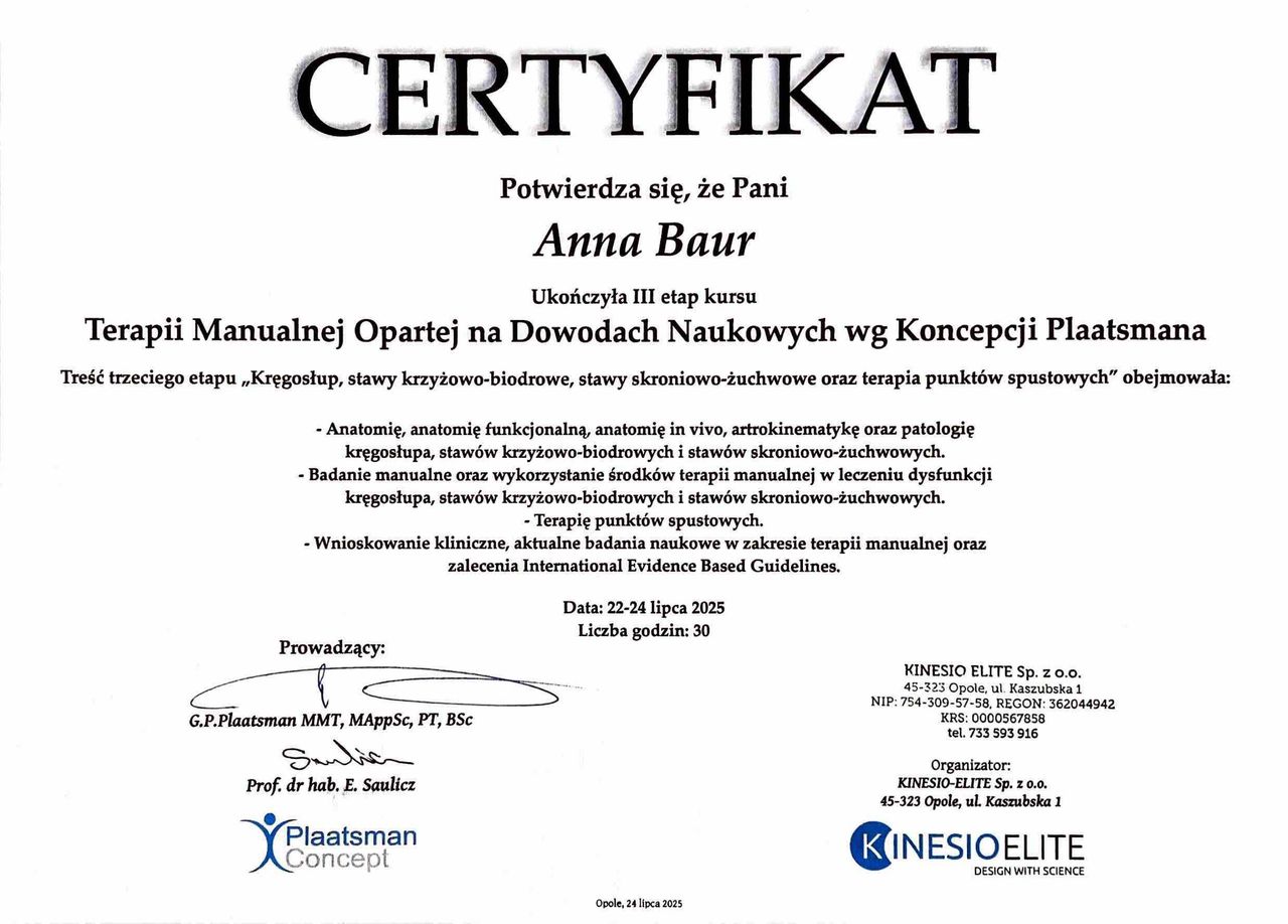 Nazywam się Ania Baur i jestem fizjoterapeutką z pasją do pomagania ludziom w odzyskiwaniu sprawności i życia bez bólu. Na co dzień pracuję z pacjentami zmagającymi się z bólem przewlekłym, urazami ortopedycznymi (np. kręgosłup, stawy, mięśnie) oraz problemami w obrębie stawu skroniowo-żuchwowego (np. bóle szczęki, zaciskanie zębów, bruksizm). W pracy łączę różne techniki terapii manualnej, suche igłowanie, pracę na tkankach miękkich oraz indywidualnie dobrane ćwiczenia. Każdy pacjent jest inny, dlatego zależy mi, by dobrze zrozumieć problem i dobrać skuteczne, ale przede wszystkim bezpieczne metody terapii. Stale się rozwijam – uczestniczę w kursach, szkoleniach i konferencjach, żeby być na bieżąco z nowoczesnymi metodami leczenia i jeszcze skuteczniej pomagać moim pacjentom. Praca fizjoterapeuty to dla mnie coś więcej niż tylko zawód – to sposób, w jaki mogę realnie poprawiać jakość życia innych. Jeśli zmagasz się z bólem, czujesz, że Twoje ciało “nie działa” jak powinno albo po prostu chcesz zadbać o swoje zdrowie i profilaktykę – zapraszam serdecznie. Wspólnie poszukamy najlepszego rozwiązania.