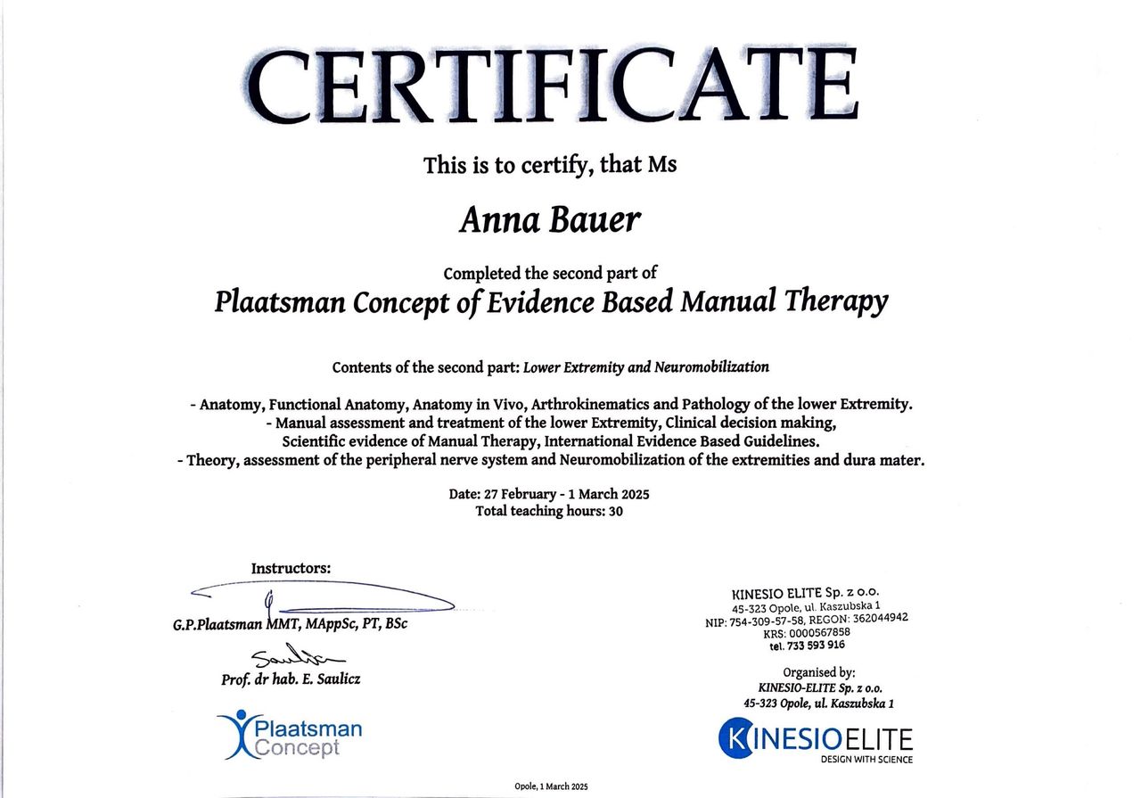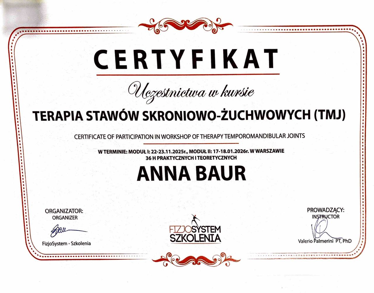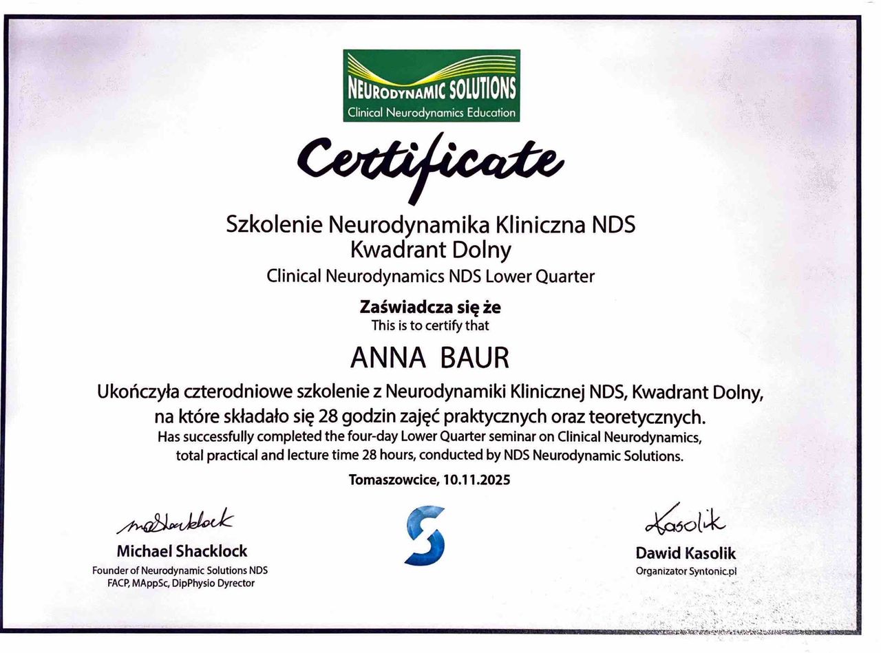 Nazywam się Ania Baur i jestem fizjoterapeutką z pasją do pomagania ludziom w odzyskiwaniu sprawności i życia bez bólu. Na co dzień pracuję z pacjentami zmagającymi się z bólem przewlekłym, urazami ortopedycznymi (np. kręgosłup, stawy, mięśnie) oraz problemami w obrębie stawu skroniowo-żuchwowego (np. bóle szczęki, zaciskanie zębów, bruksizm). W pracy łączę różne techniki terapii manualnej, suche igłowanie, pracę na tkankach miękkich oraz indywidualnie dobrane ćwiczenia. Każdy pacjent jest inny, dlatego zależy mi, by dobrze zrozumieć problem i dobrać skuteczne, ale przede wszystkim bezpieczne metody terapii. Stale się rozwijam – uczestniczę w kursach, szkoleniach i konferencjach, żeby być na bieżąco z nowoczesnymi metodami leczenia i jeszcze skuteczniej pomagać moim pacjentom. Praca fizjoterapeuty to dla mnie coś więcej niż tylko zawód – to sposób, w jaki mogę realnie poprawiać jakość życia innych. Jeśli zmagasz się z bólem, czujesz, że Twoje ciało “nie działa” jak powinno albo po prostu chcesz zadbać o swoje zdrowie i profilaktykę – zapraszam serdecznie. Wspólnie poszukamy najlepszego rozwiązania.