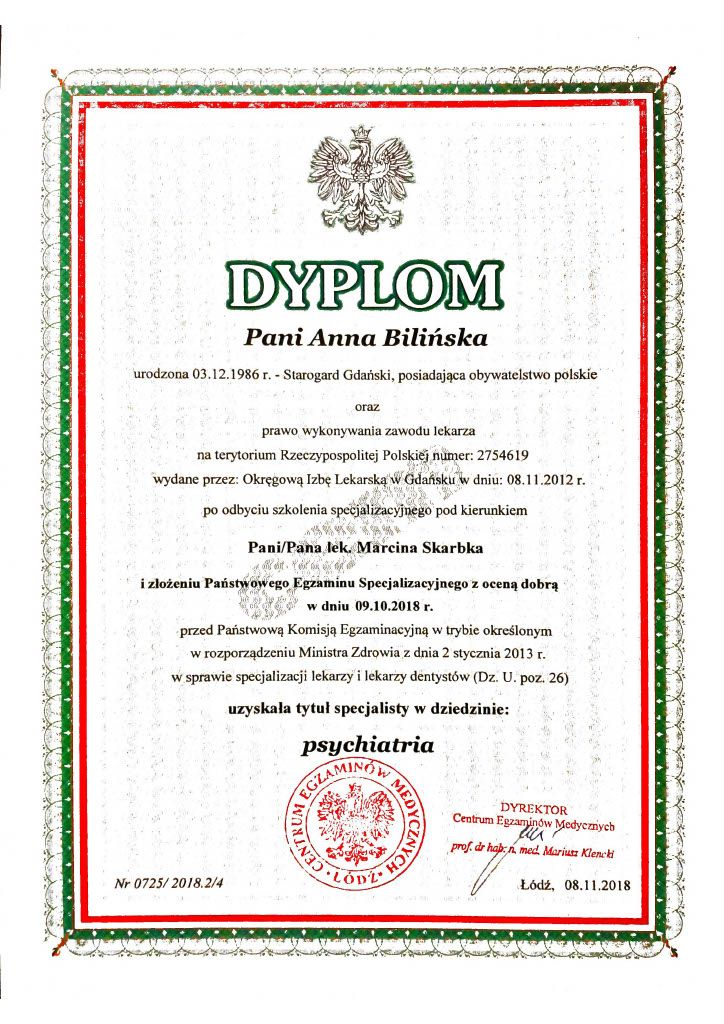 Jestem lekarzem psychiatrą i psychoterapeutą. Ukończyłam Wydział Lekarski Gdańskiego Uniwersytetu Medycznego oraz specjalizację z psychiatrii w Wojewódzkim Szpitalu Psychiatrycznym im. T. Bilikiewicza w Gdańsku, gdzie pracowałam również po jej ukończeniu (m.in. na stanowisku ordynatora oddziału ogólnopsychiatrycznego). Posiadam też doświadczenie w pracy psychiatrycznej ambulatoryjnej ( pracowałam zarówno w Poradni Zdrowia Psychicznego Optimmed w ramach NFZ, jak i ramach prywatnej opieki medycznej w Centrum Medycznym Polmed, ostatecznie rozwijając swoją indywidualną praktykę specjalistyczną w gabinecie prywatnym). Jestem absolwentką czteroletniej Szkoły Psychoterapii Poznawczo-Behawioralnej Uniwersytetu SWPS w Sopocie i certyfikowanym psychoterapeutą poznawczo – behawioralnym, szkolącym się obecnie w nurcie Terapii Schematów. Aktualnie poszerzam zakres swojej działalności psychiatrycznej (przyjmuję pacjentów DOROSŁYCH, czyli mających ukończony 18-ty rok życia). Nie przyjmuję na ten moment nowych pacjentów w proces psychoterapeutyczny, jednak w swojej pracy psychiatrycznej wykorzystuję aktywnie swoje umiejętności widzenia pacjenta również w perspektywie psychoterapeutycznej, zarówno w zakresie diagnozy i rozumienia etiologii doznawanych przez niego trudności, jak i w zakresie dynamiki procesu zdrowienia. Jestem otwarta na współpracę z innymi specjalistami biorącymi udział w leczeniu moich klientów celem umożliwienia im jak najbardziej kompleksowego i holistycznego podejścia wobec doświadczanych problemów.