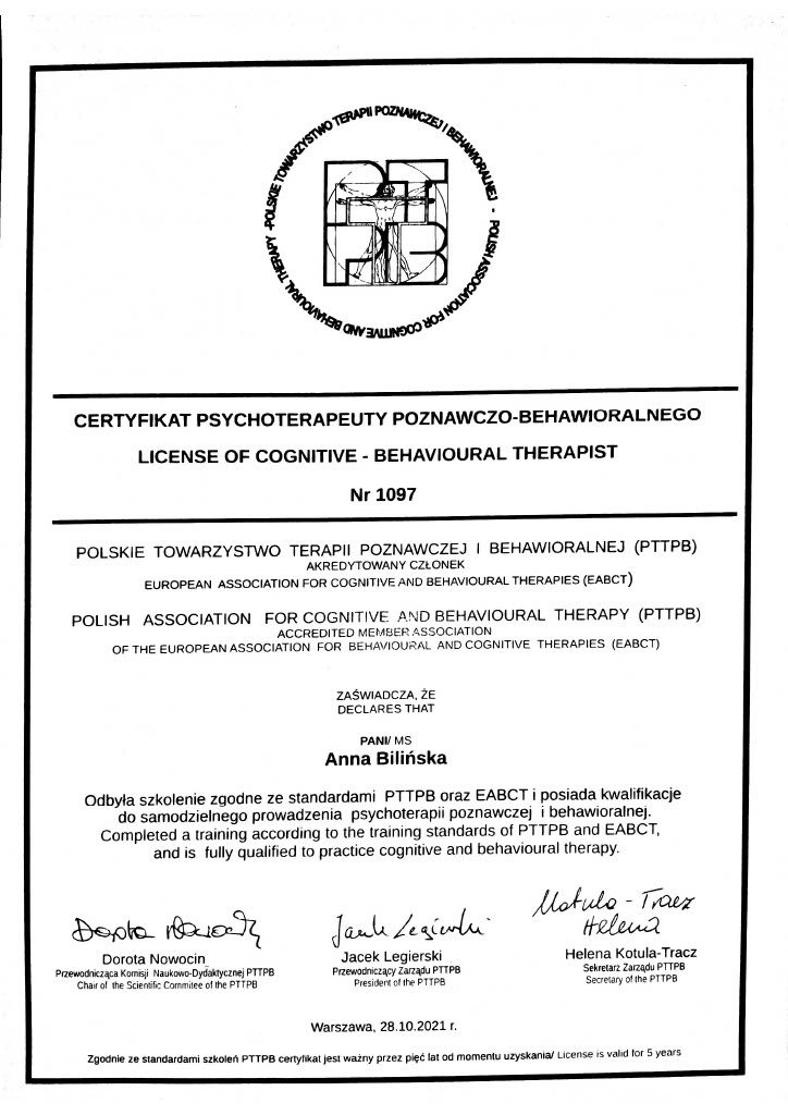 Jaki jest zakres porad oferowanych przez Anna Bilińska?Anna Bilińska to psychiatra, psychoterapeuta certyfikowany. Na podstawie swojego doświadczenia i wykształcenia Anna Bilińska oferuje usługi takie jak: konsultacja psychiatryczna (kolejna wizyta), konsultacja psychiatryczna (pierwsza wizyta), konsultacja psychiatryczna, diagnoza ADHD dla dorosłych, konsultacja online, konsultacja online (pierwsza), konsultacja online (kolejna), Psychoterapia.