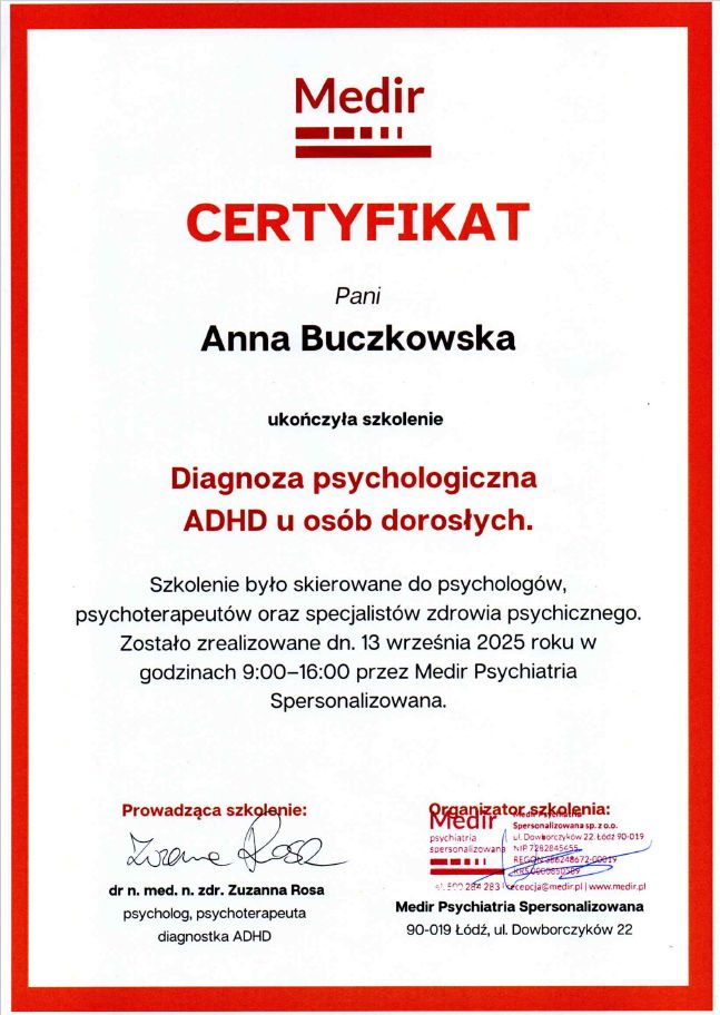 Czy Anna Buczkowska przyjmuje online, bez konieczności pojawiania się w placówce?Tak, Anna Buczkowska oferuje konsultacje online. Wybierz opcję „konsultacja online” przy umawianiu wizyty, a zobaczysz dostępne terminy.