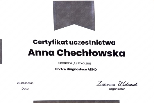 Zajmuję się również diagnozą ADHD u osób dorosłych, wykorzystując narzędzia diagnostyczne oraz szczegółowy wywiad kliniczny. Proces diagnostyczny ma na celu rzetelną ocenę trudności oraz pomoc w lepszym zrozumieniu własnego funkcjonowania.