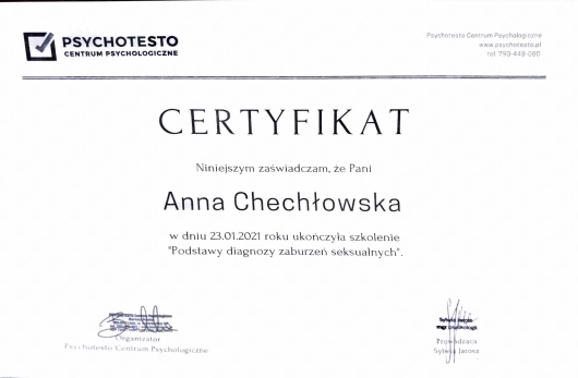 Jestem psycholożką, absolwentką jednolitych studiów magisterskich na Uniwersytecie Kazimierza Wielkiego w Bydgoszczy. Obecnie poszerzam swoje kompetencje zawodowe, studiując seksuologię kliniczną na Warszawskim Uniwersytecie Medycznym oraz przygotowanie pedagogiczne w Wyższej Szkole Nauk o Zdrowiu. Stale rozwijam swoją wiedzę i umiejętności, aby jak najlepiej wspierać osoby zgłaszające się po pomoc.