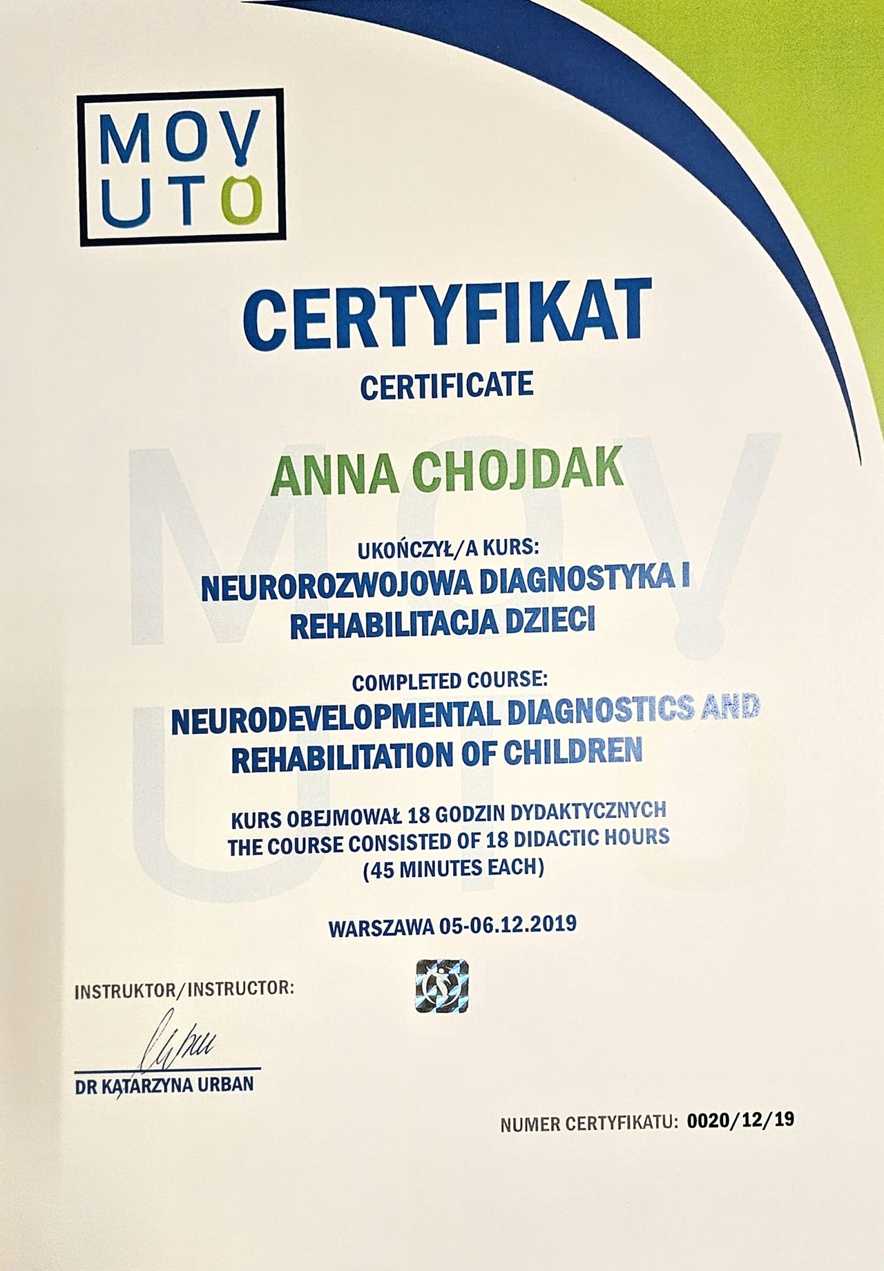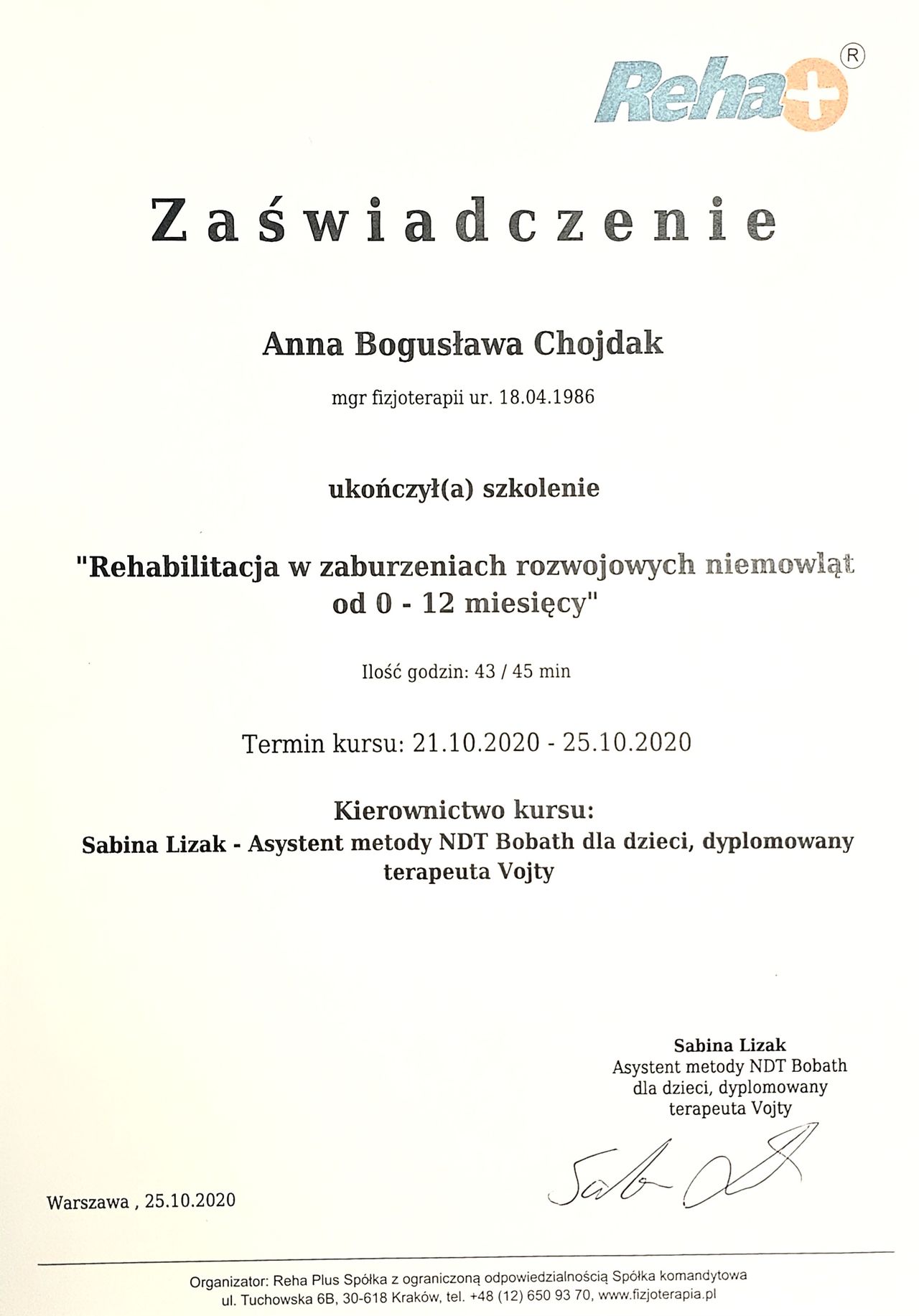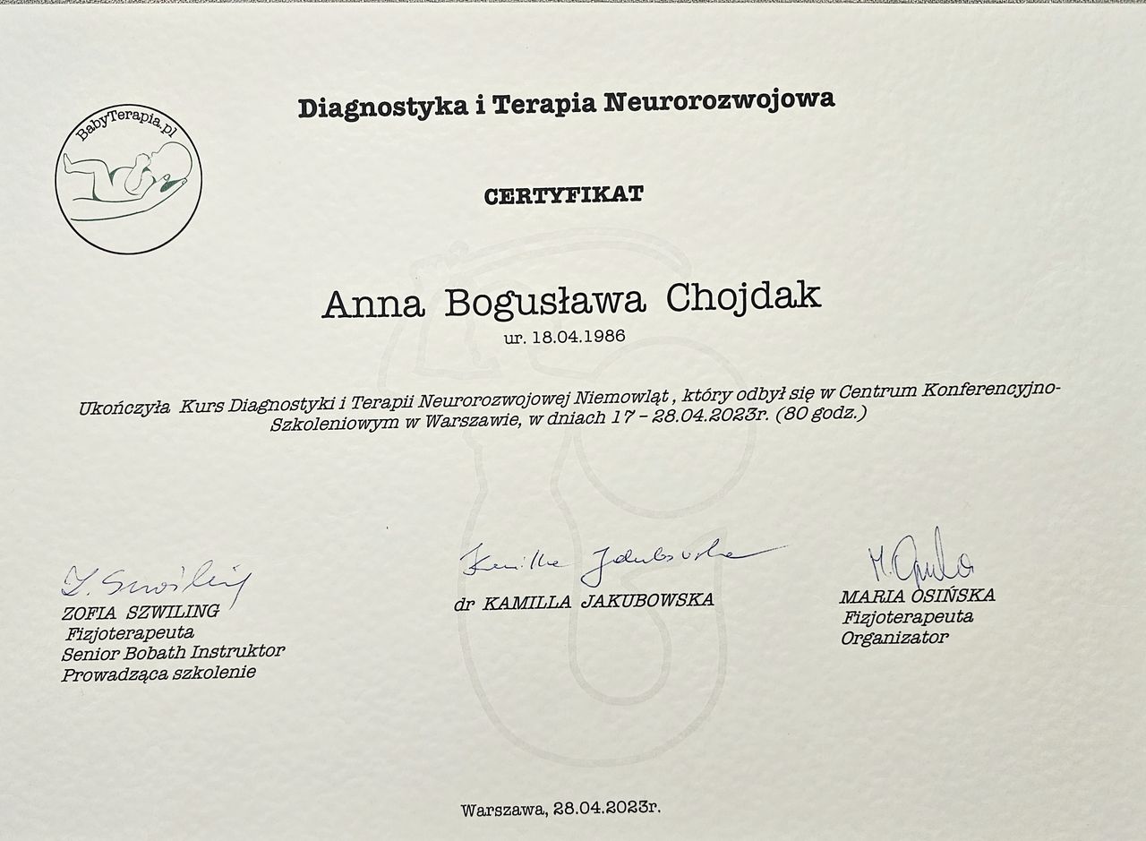 Jaki jest zakres porad oferowanych przez Anna Chojdak?Anna Chojdak to fizjoterapeuta dziecięcy, fizjoterapeuta. Na podstawie swojego doświadczenia i wykształcenia Anna Chojdak oferuje usługi takie jak: konsultacja fizjoterapeutyczna dzieci, rehabilitacja dzieci, fizjoterapia niemowląt, fizjoterapia dzieci, konsultacja fizjoterapeutyczna niemowląt, instruktaż niemowlęcy, badanie układu ruchu, badanie wad postawy, ćwiczenia korekcyjne, FITS.