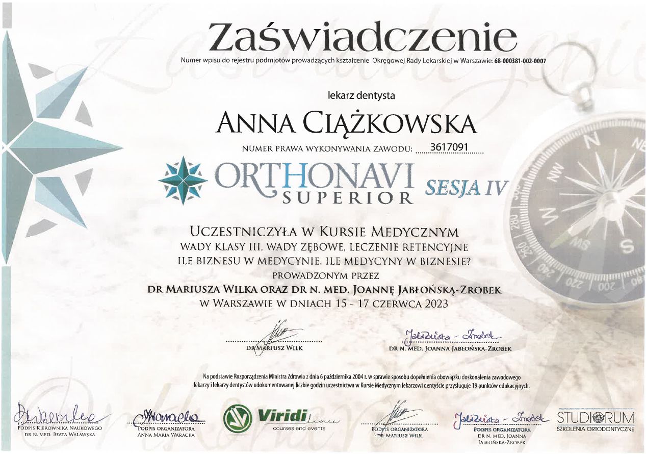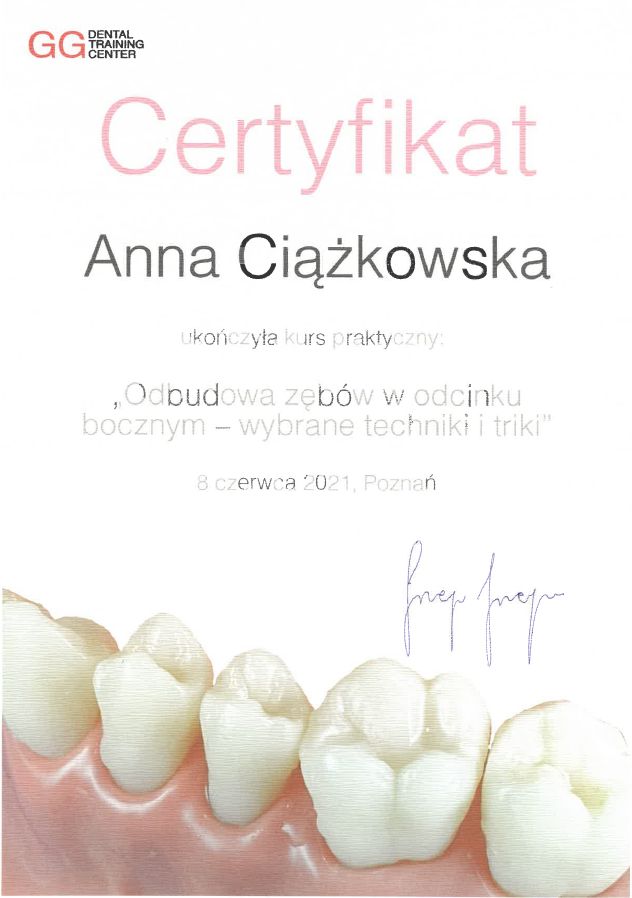 Regularnie uczestniczę w prestiżowych kursach i konferencjach, ciągle doskonaląc swoje umiejętności i kompetencje, aby przeprowadzać leczenie według najnowszych standardów.