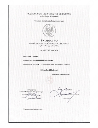 Jestem psycholożką, seksuolożką kliniczną oraz psychoterapeutką w trakcie szkolenia w nurcie poznawczo-behawioralnym (CBT) w Szkole Psychoterapii Crescentia, rekomendowanej przez Polskie Towarzystwo Terapii Poznawczej i Behawioralnej (PTTPB). Pracuję z osobami dorosłymi oraz młodzieżą od 15. roku życia.