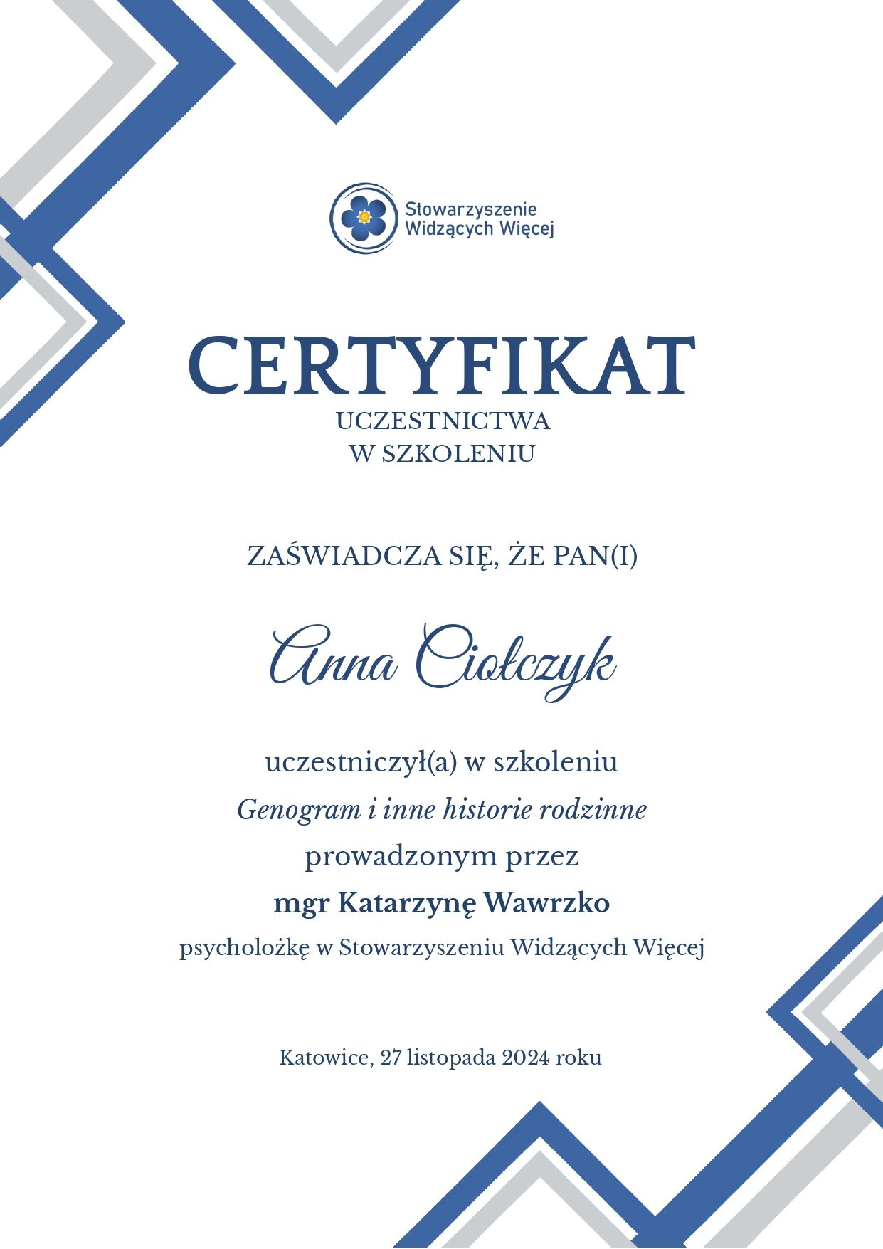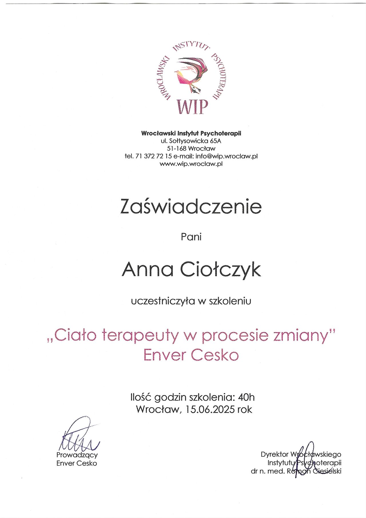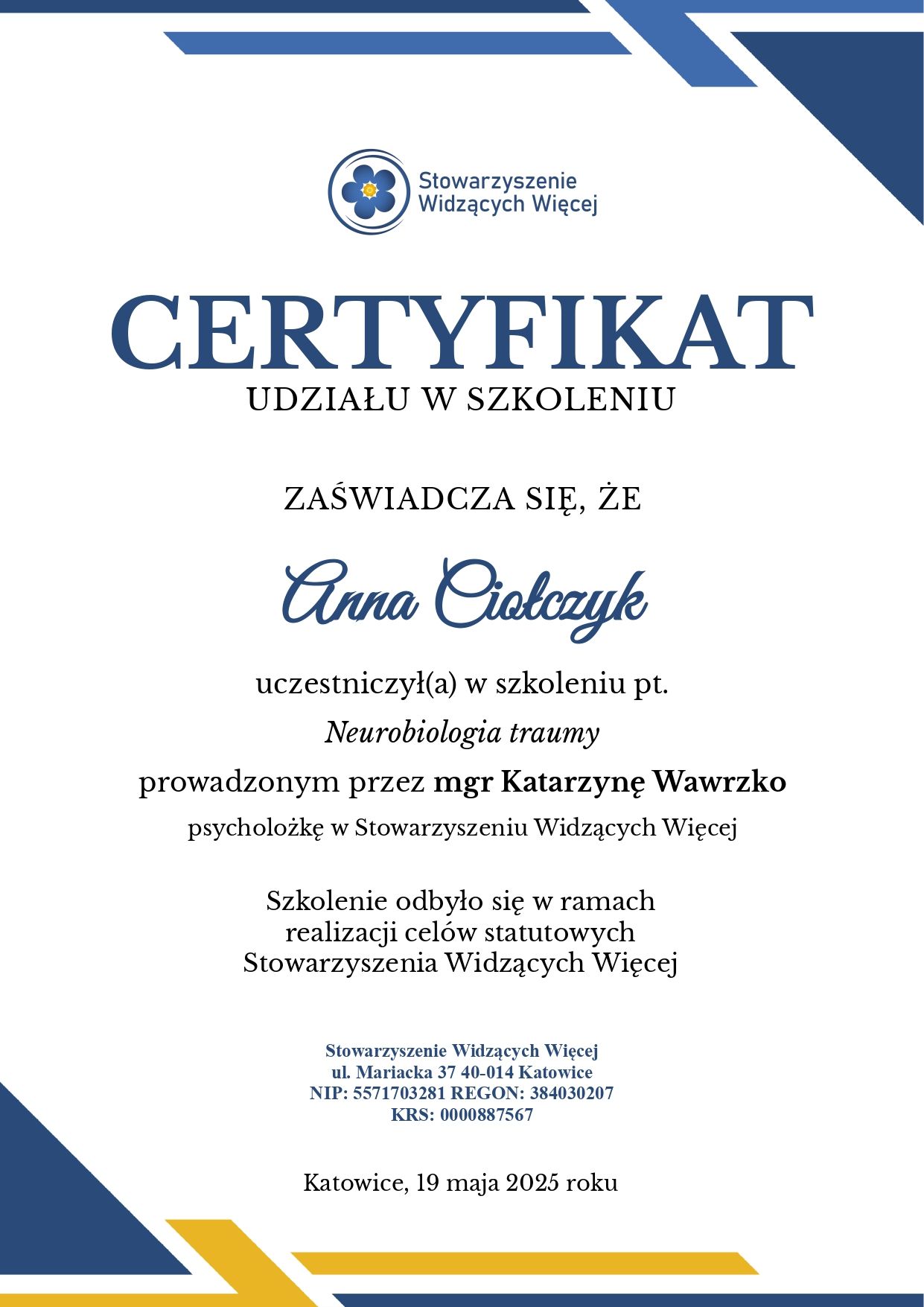Jestem członkiem Polskiego Towarzystwa Psychoterapii Stosowanej a także World Association for Positive and Transcultural Psychotherapy.