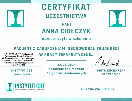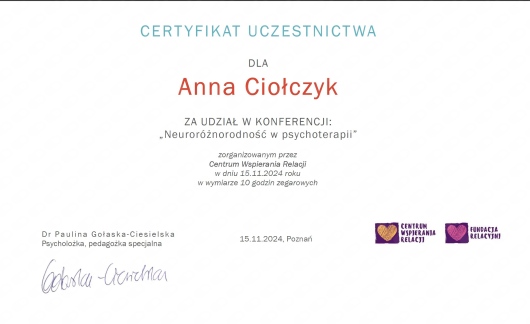 Pani Ania to wspaniała kobieta. Mam przyjemność współpracować z Nią już od jakiegoś czasu i uważam, że jest świetną specjalistką , pełną wiedzy i bardzo kompetentną. Poza tym, że jest bardzo miła, spokojna i opanowana , nie ocenia, to potrafi świetnie wysłuchać, doradzić. Czuję się przy niej bardzo swobodnie, to człowiek anioł :) nauczyła mnie żyć w zgodzie z sobą , wiele rzeczy uświadomiła i pokazała mi jak można inaczej spoglądać na świat. Rozmowy z Panią Anią to czas w którym uczę się siebie na nowo. Bardzo pomogła mi zrozumieć wiele kwestii dotyczących mojego dzieciństwa oraz życia dorosłego. Bardzo polecam i szczerze oby wszyscy psychoterapeuci byli tacy jak Pani Ania !