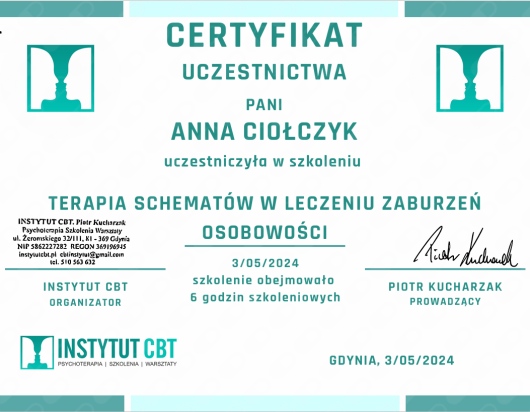 Czy Anna Ciołczyk przyjmuje online, bez konieczności pojawiania się w placówce?Tak, Anna Ciołczyk oferuje konsultacje online. Wybierz opcję „konsultacja online” przy umawianiu wizyty, a zobaczysz dostępne terminy.