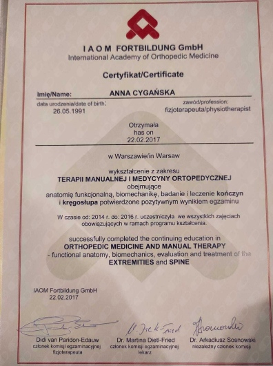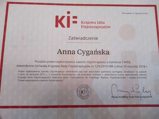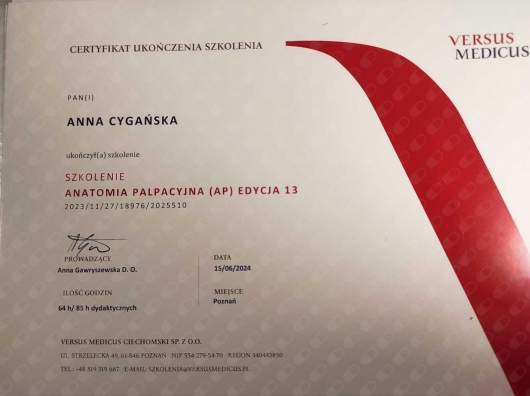 Jaki jest zakres porad oferowanych przez Anna Cygańska?Anna Cygańska to fizjoterapeuta. Na podstawie swojego doświadczenia i wykształcenia Anna Cygańska oferuje usługi takie jak: ćwiczenia korekcyjne, Fizjoterapia dyskopatii w ostrym stanie, fizjoterapia dzieci, Fizjoterapia pourazowa, fizjoterapia przed- i pooperacyjna, Fizjoterapia stawów skroniowo-żuchwowych, fizjoterapia stomatologiczna, kinezyterapia, masaż całościowy – terapia manualna, masaż głęboki.