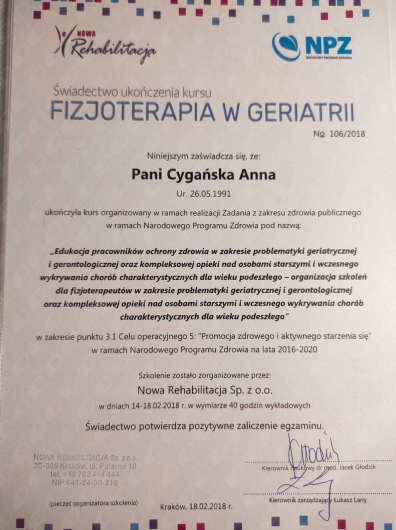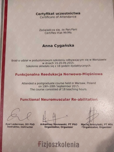 Od 2021 r. prowadzę także regularne zajęcia ruchowe dla seniorów. Wykorzystuję w swojej pracy ćwiczenia jak i techniki z zakresu pracy ze świadomością ciała. Łączę pracę kliniczną z pracą nauczyciela akademickiego (wykładam na Wydziale Rehabilitacji AWF Warszawa).