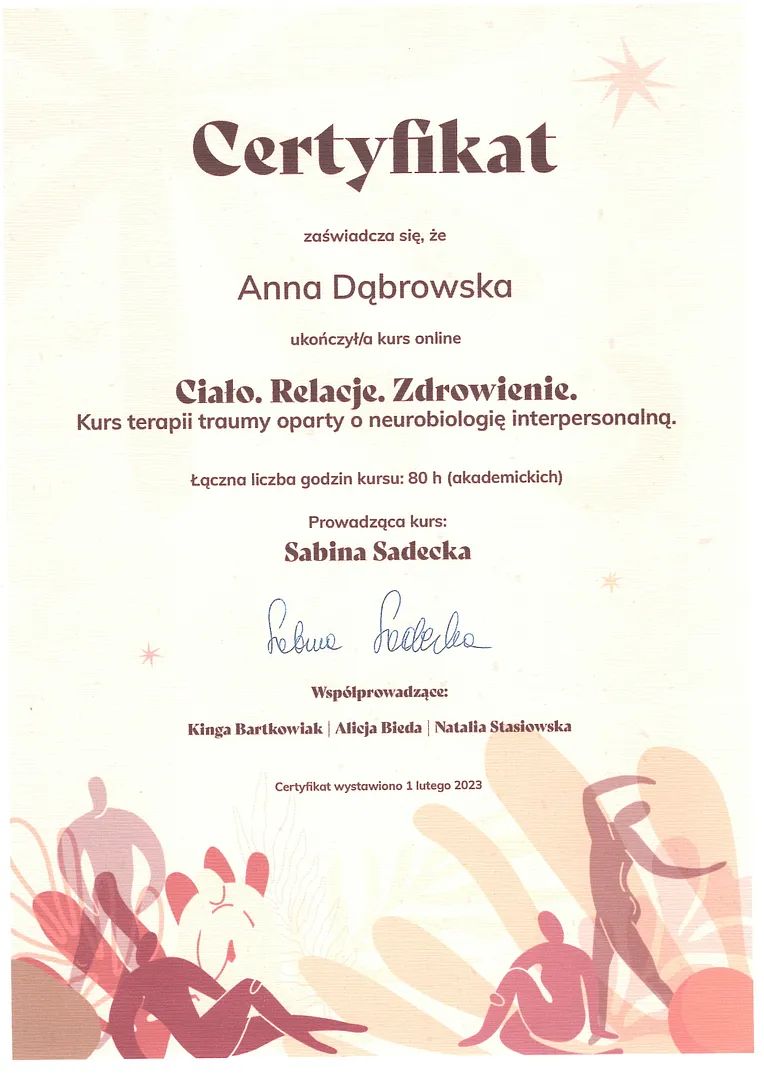 Od kilku lat współpracuję z Centrum Praw Kobiet w Gdańsku, prowadząc konsultacje i grupy wsparcia dla kobiet doświadczających przemocy. Wspieram również osoby przeciążone, nadmiernie krytyczne wobec siebie, które chcą wreszcie stanąć po swojej stronie.