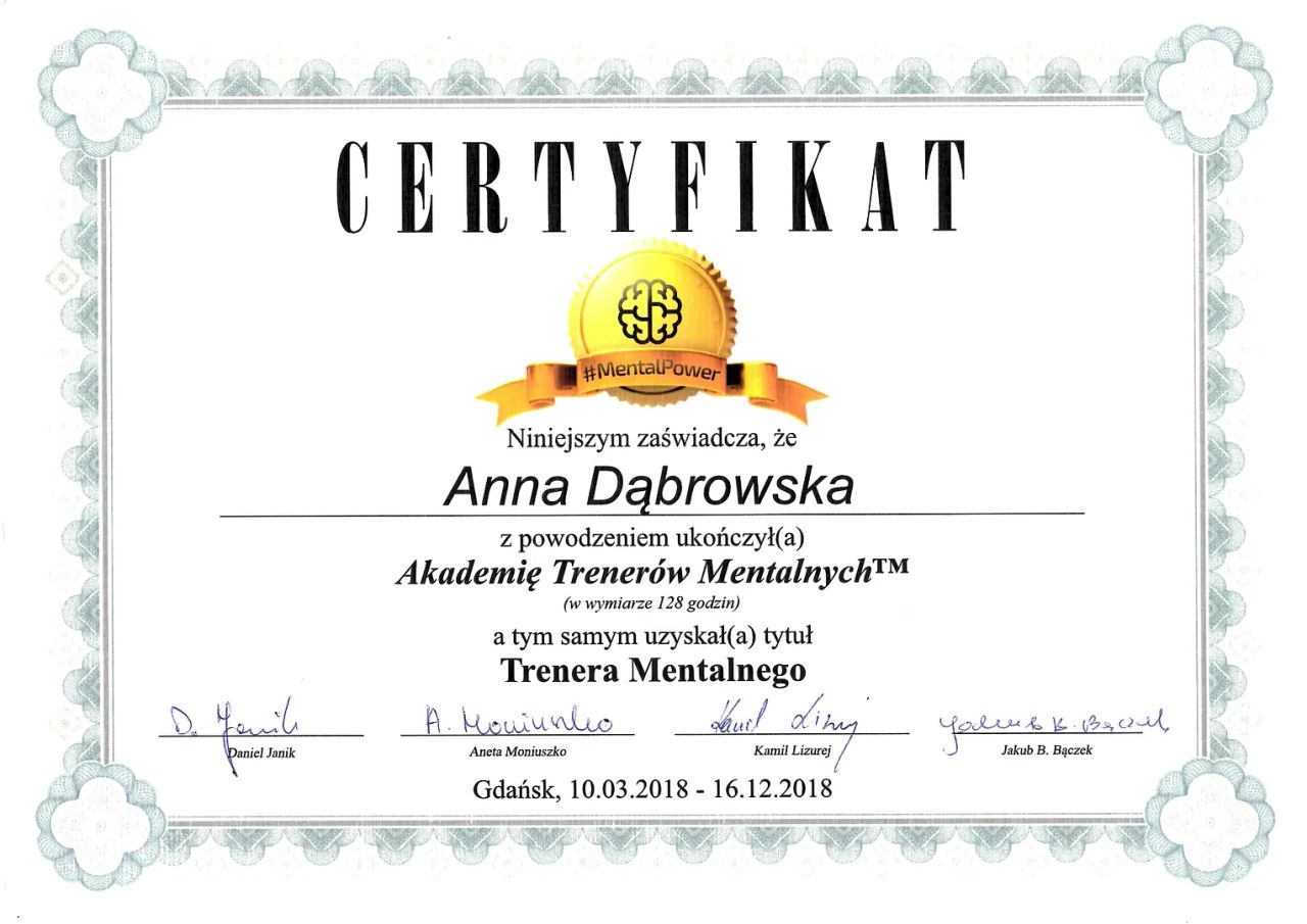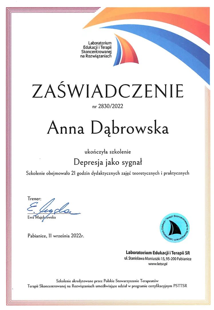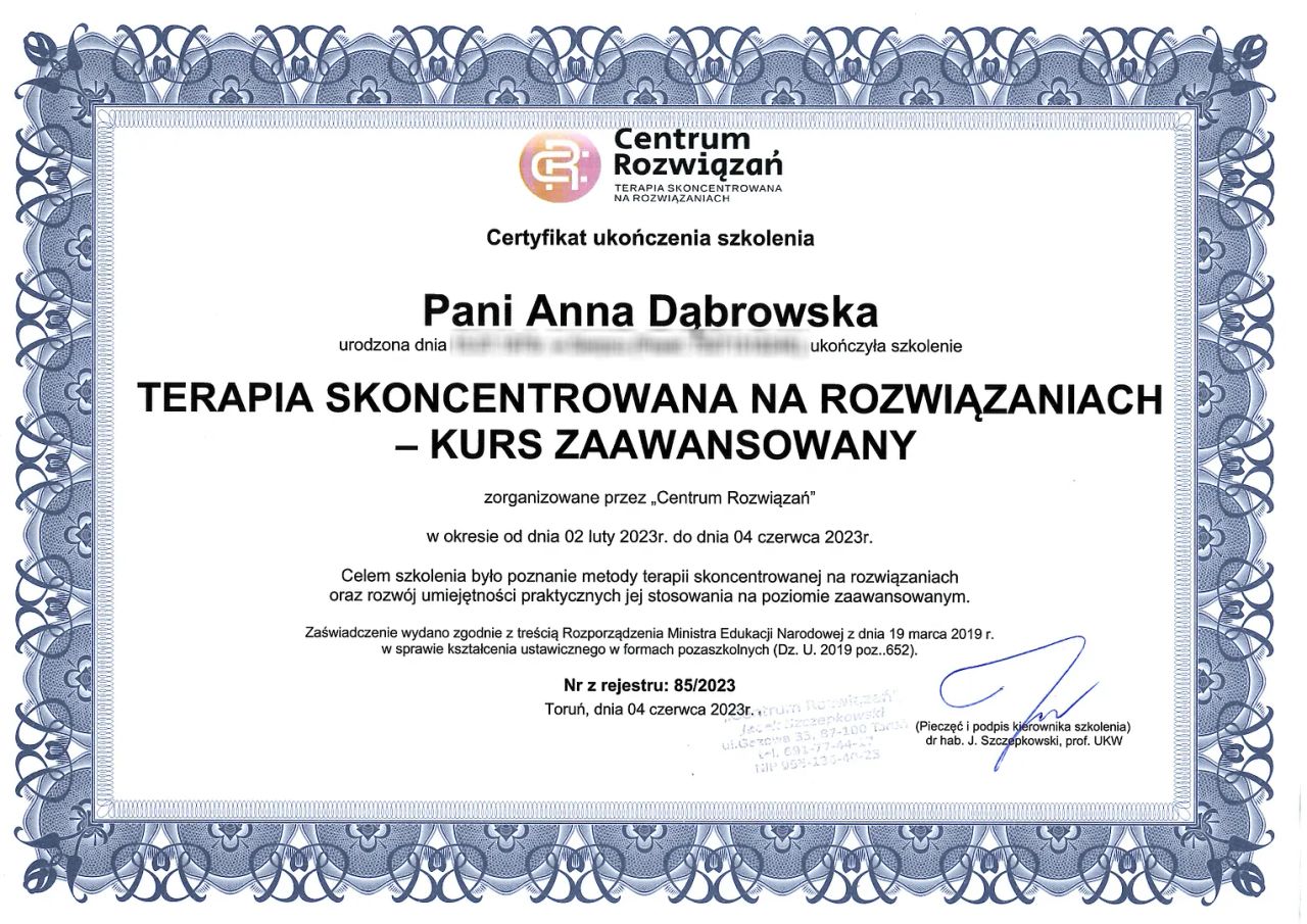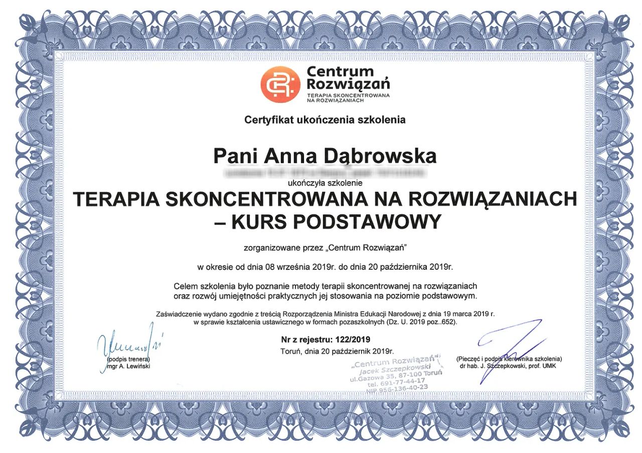 Pracuję w nurcie Terapii Skoncentrowanej na Rozwiązaniach (TSR), łączę uważność i empatię z konkretnym wsparciem. Wykorzystuję także elementy fototerapii, metafory i treningu mentalnego.