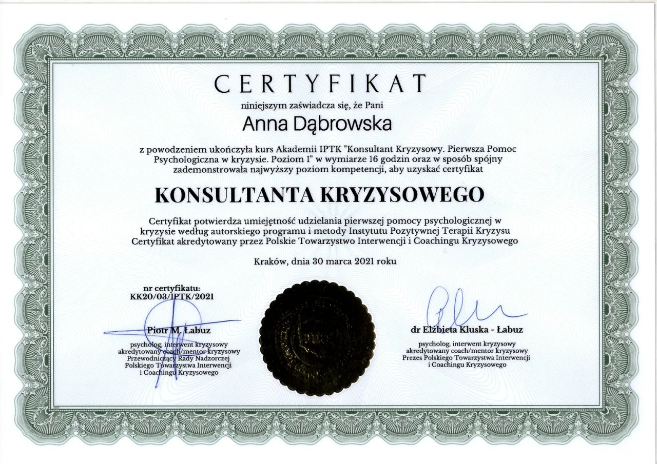 Jestem psycholożką, trenerką mentalną i konsultantką kryzysową.