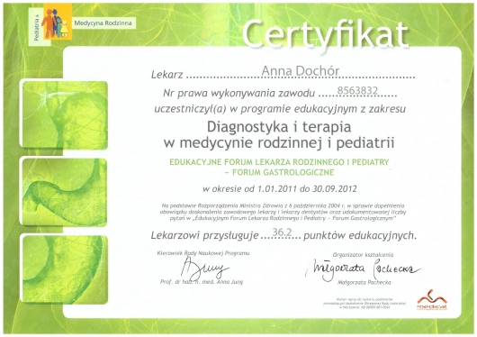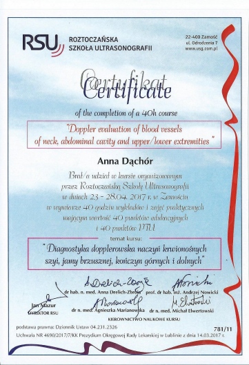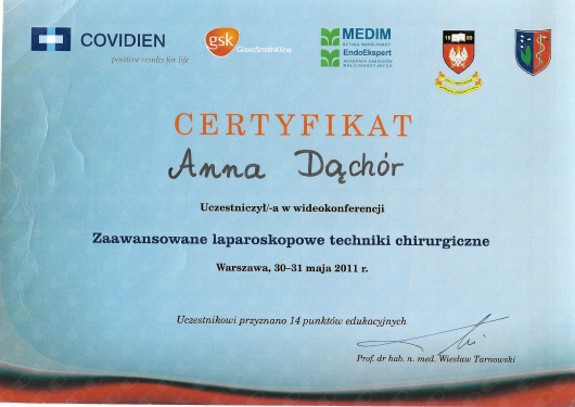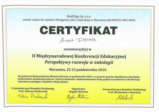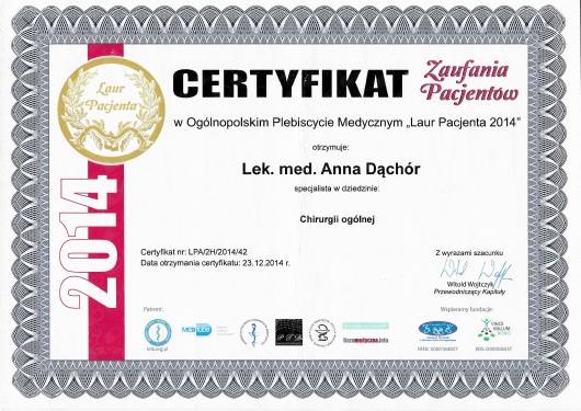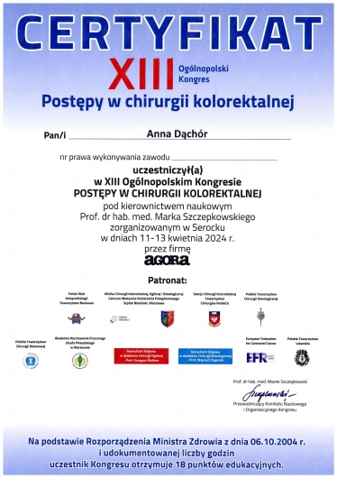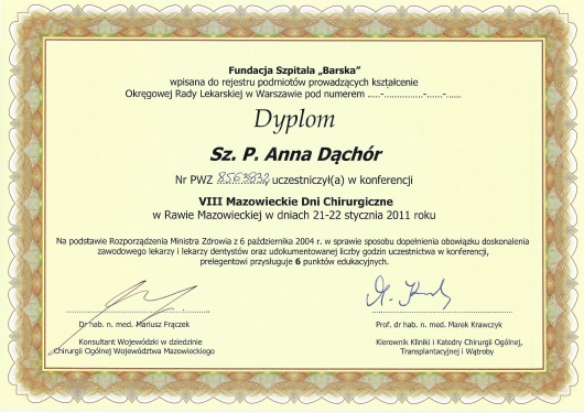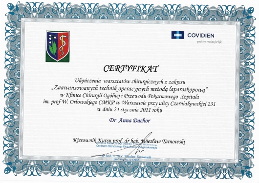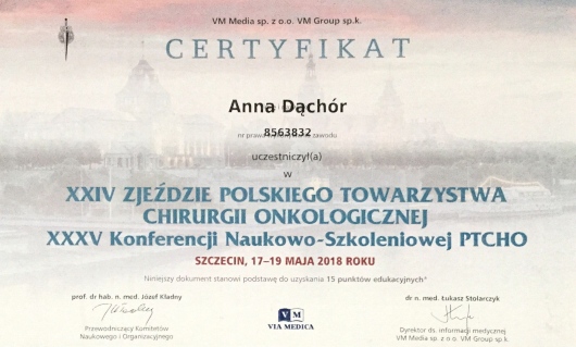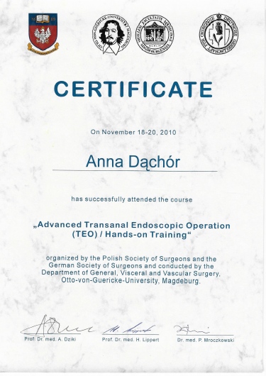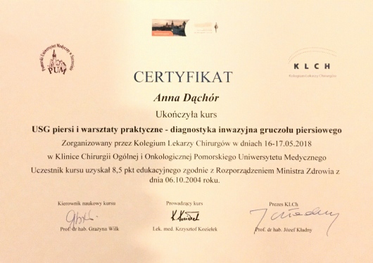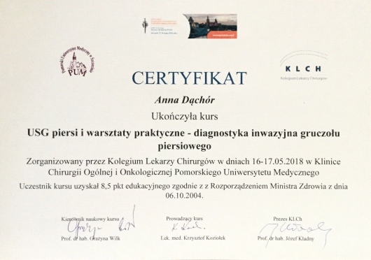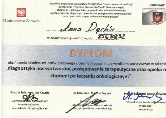 Lekarz specjalista Chirurgii Ogólnej. Absolwentka Wydziału Lekarskiego Akademii Medycznej w Lublinie. Dyplom Lekarza uzyskałam w 1995 roku. Doświadczenie zawodowe zdobyłam pracując w Szpitalu Chirurgicznym i Szpitalu Wojewódzkim w Legnicy, w Jaworskim Centrum Medycznym, w EMC Instytut Medyczny w Kamieniu Pomorskim – na stanowisku asystenta i z-cy ordynatora, w oddziale Chirurgii Ogólnej, Onkologicznej i Gastroenterologicznej WSCU św. Anny w Warszawie, w WIML w Warszawie. Doświadczenie zawodowe zbudowałam pracą wśród chorych, na salach operacyjnych, a także uczestnicząc w licznych zjazdach i spotkaniach szkoleniowych, organizowanych zarówno w Polsce jak i poza granicami kraju.