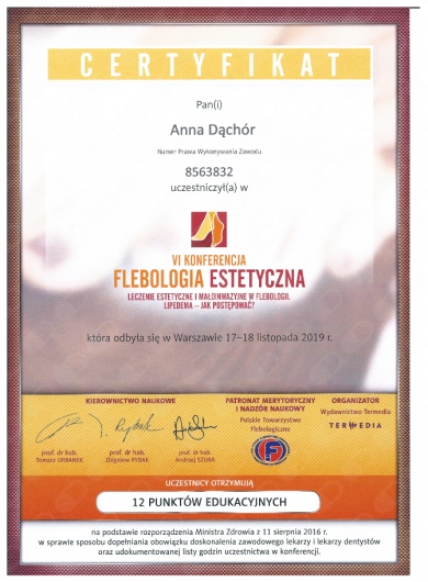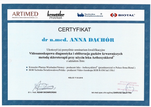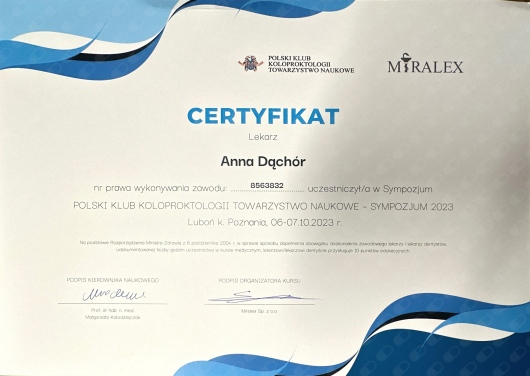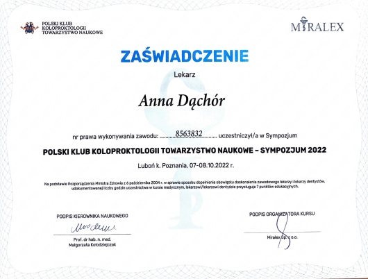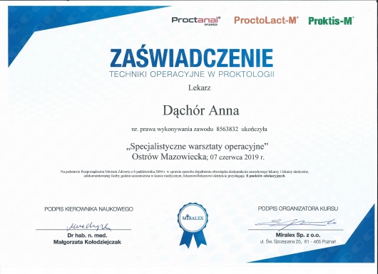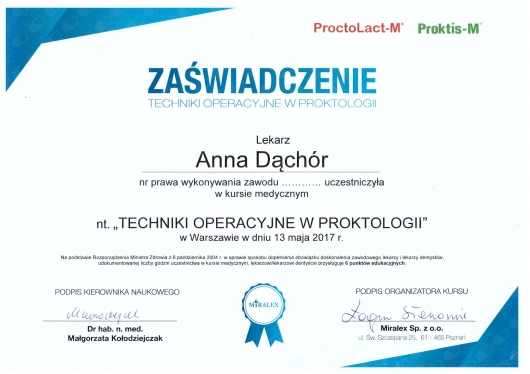 Aktywnie uczestniczę w zjazdach, kursach i warsztatach udoskonalając leczenie hemoroidów, szczeliny odbytu, przetok odbytu oraz żylaków kończyn dolnych. Uważam, że dokładna diagnostyka proktologiczna i flebologiczna umożliwia wdrożenie skutecznych terapii. W celu uzyskania najlepszych efektów terapeutycznych rekomenduję terapie hybrydowe.