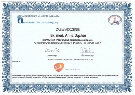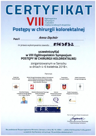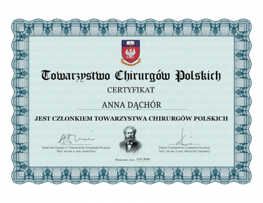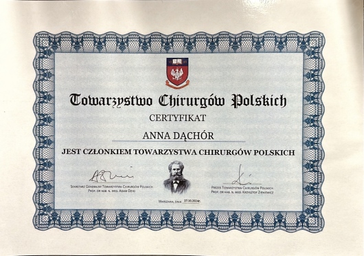 Jestem członkiem Towarzystwa Chirurgów Polskich, Polskiego Towarzystwa Flebologicznego oraz Polskiego Klubu Koloproktologii - Towarzystwo Naukowe . Posiadam umiejętności w zakresie chirurgii ogólnej, chirurgii małoinwazyjnej, technik laparoskopowych, jak również w leczeniu chorób naczyń żylnych, proktologii.