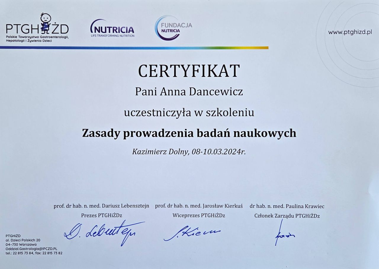 Jestem członkiem Polskiego Towarzystwa Gastroenterologii oraz Polskiego Towarzystwa Gastroenterologii, Hepatologii i Żywienia Dzieci.