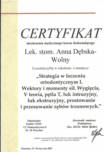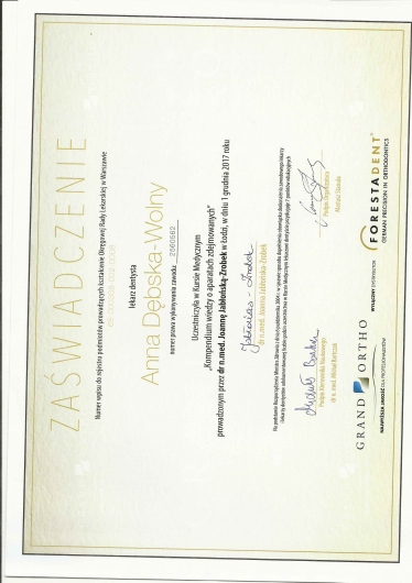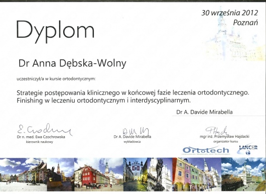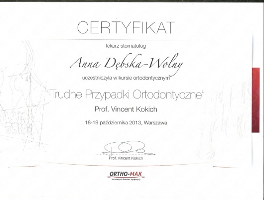 Jaki jest zakres porad oferowanych przez Anna Dębska - Wolny?Anna Dębska - Wolny to stomatolog, ortodonta. Na podstawie swojego doświadczenia i wykształcenia Anna Dębska - Wolny oferuje usługi takie jak: zdjęcia cefalometryczne, konsultacja ortodontyczna, aparat samoligaturujący Damon, konsultacja ortodontyczna dzieci, Aparat nakładkowy.