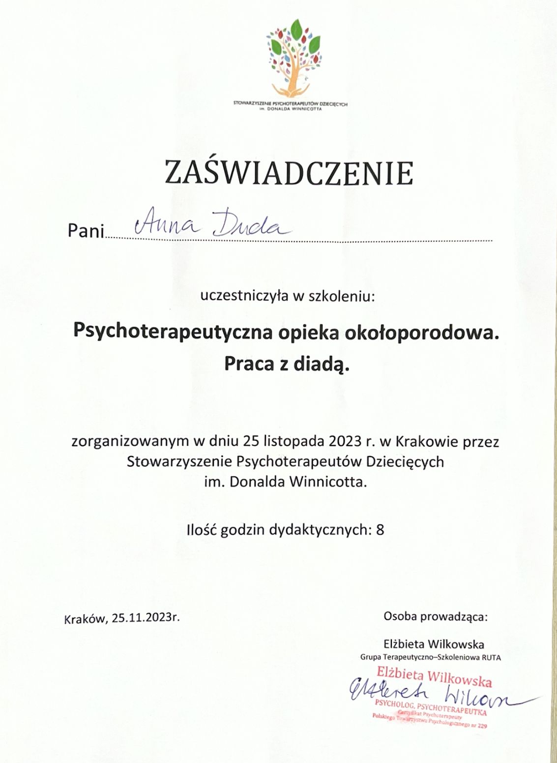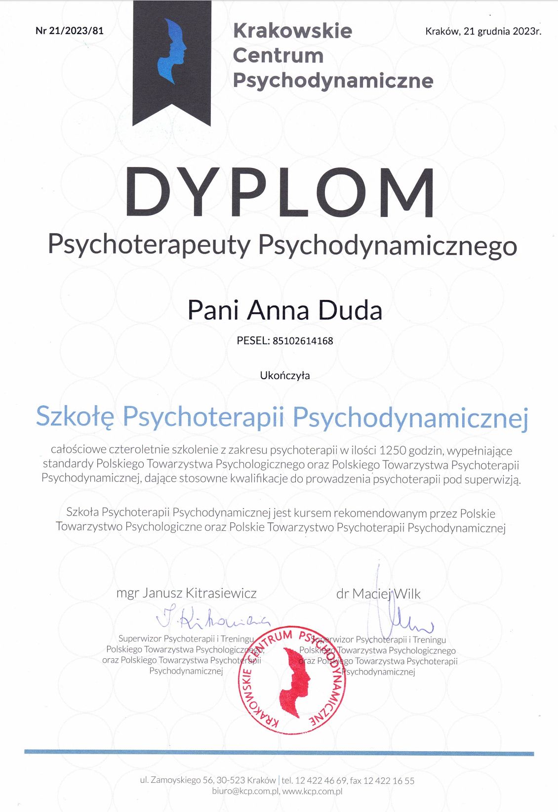 Jestem psycholożką i dyplomowaną psychoterapeutką psychodynamiczną. Oferuję psychoterapię i wsparcie psychologiczne dla osób dorosłych, wsparcie okołoporodowe oraz konsultacje dla rodziców. Jestem absolwentką psychologii na Uniwersytecie Jagiellońskim. Ukończyłam czteroletnie całościowe szkolenie psychoterapeutyczne w Krakowskim Centrum Psychodynamicznym.