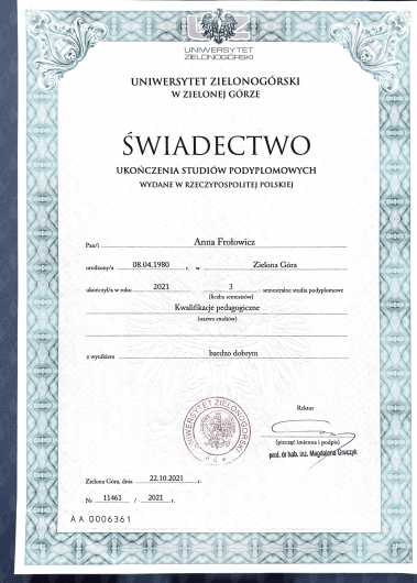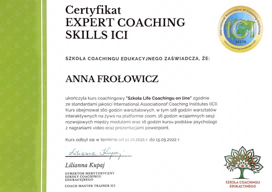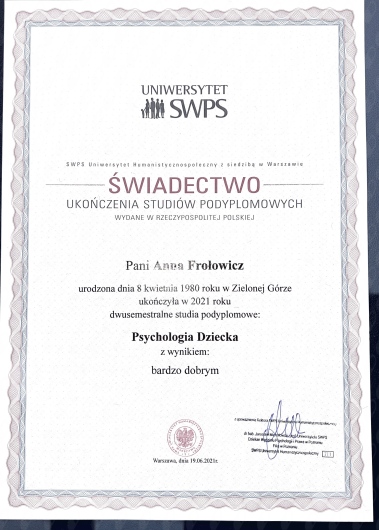 Kilka słów o mnie… Od prawie 20 lat pracuję nad moją pasją – samorozwojem. Ukończyłam psychologię (SWPS Uniwersytet Humanistycznospołeczny we Wrocławiu) oraz coaching (Certyfikat Expert Coaching Skills ICI w Szkole Coachingu Edukacyjnego Lilianny Kupaj). Oba kierunki, wraz z moim własnym doświadczeniem, przygotowały mnie do tego, aby móc pomagać Tobie – w zakresie zarówno pomocy psychologicznej, jak i wsparcia rozwojowego (coachingowego). Dodatkowo skończyłam podyplomowo Psychologię Dziecka (SWPS Poznań) oraz posiadam Kwalifikacje Pedagogiczne (UZ w Zielonej Górze). Nie będę tu wymieniać wszystkich możliwych wyzwań, spraw i problemów, z którymi możesz do mnie przyjść. Możesz do mnie przyjść ze wszystkim. Bardzo ważne dla mnie jest nawiązanie nici porozumienia i zaufanie, stworzenie bliskiej relacji z drugim człowiekiem. Wierzę, że tylko w taki sposób można pomóc drugiej osobie. Jeśli się tak dzieje – można osiągnąć niezwykle dużo. Czasami jest tak, że trzeba przepracować coś, co Cię męczy. Coś się wydarzyło w przeszłości i utrudnia teraźniejszość. Chwilami masz tak dość, że masz wrażenie, że już nic się nie da. Pomogę Ci zmierzyć się z Twoimi problemami, lękami, smutkiem. Będę Cię wspierać na drodze zdrowienia całą swoją wiedzą i doświadczeniem. Bliska memu sercu jest również praca z osobami, które poczuły, że chcą w swoim życiu coś zmienić, spróbować czegoś nowego. Czujesz, że coś Ci nie pasuje lub czegoś Ci brakuje. Trudno Ci jednak określić, co to dokładnie miałoby być. Może też być wręcz przeciwnie – dokładnie wiesz co, ale nie wiesz jak. Czujesz przytłoczenie, brak Ci odwagi i wiary we własne siły. Wierzę, że absolutnie każdy z nas ma zasoby i mocne strony, i uwielbiam je z Tobą odkrywać! W ramach wsparcia rozwojowego (coachingowego) pomagam w odnajdywaniu własnych możliwości i budowaniu wewnętrznej siły. Mam też swoją misję:) Diagnoza dorosłych pod kątem ADHD. Zwłaszcza kobiet, u których obraz objawów bywa niejasny, maskowany i często mylony z innymi zaburzeniami, chorobami. Prawidłowa diagnoza zmienia życie… pomaga zrozumieć siebie od nowa, a może nawet po raz pierwszy w życiu, tak naprawdę. Uczę i pomagam układać sobie życie z nową wiedzą o sobie. Edukuję rodziców pociech z ADHD. Pomagam też młodzieży nauczyć się, jak żyć z ADHD i świetnie sobie radzić, a nawet polubić się z tą diagnozą:) W swojej pracy pomagam również najmłodszym oraz ich rodzinom. Dzieci trochę starsze przyjmuję w gabinecie, natomiast dla młodszych udzielam wsparcia rodzicom/opiekunom. Na pierwszą wizytę zapraszam samych rodziców/opiekunów, ponieważ mam dużo pytań o Wasze pociechy:) Cóż więcej mogę powiedzieć – zachęcam Cię do kontaktu :)