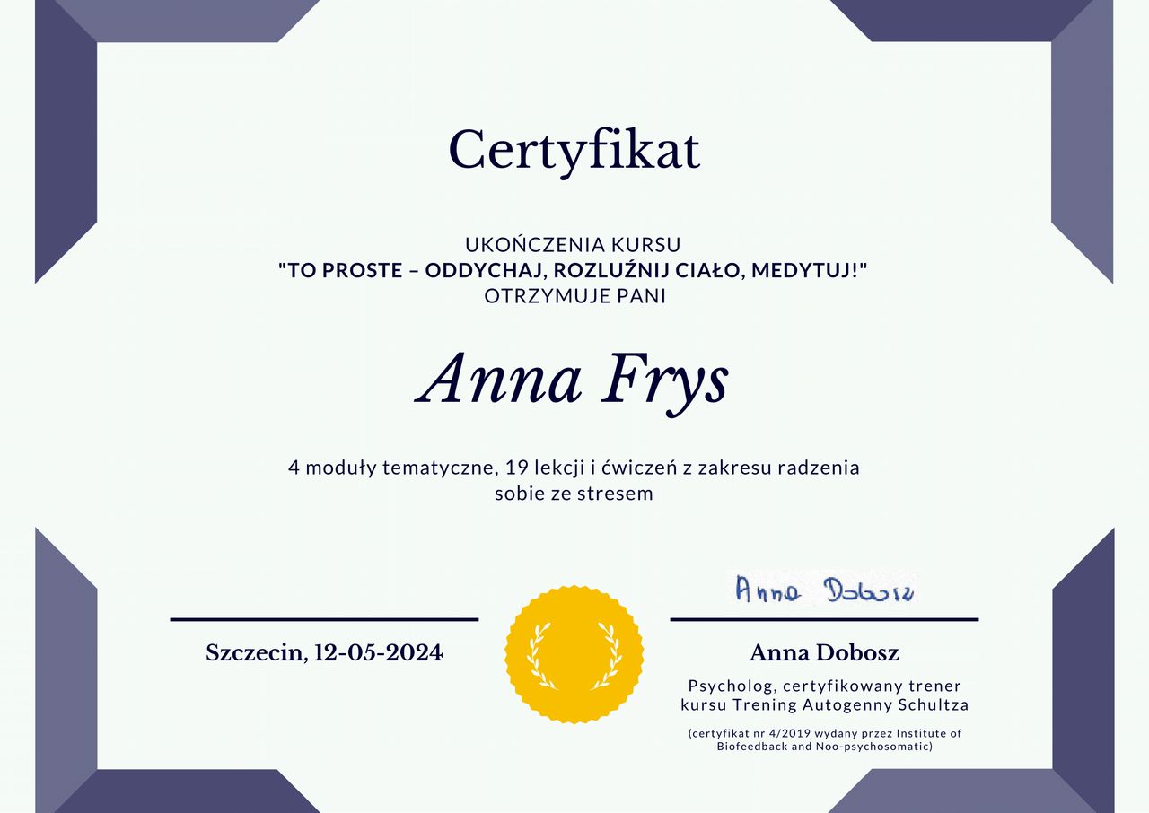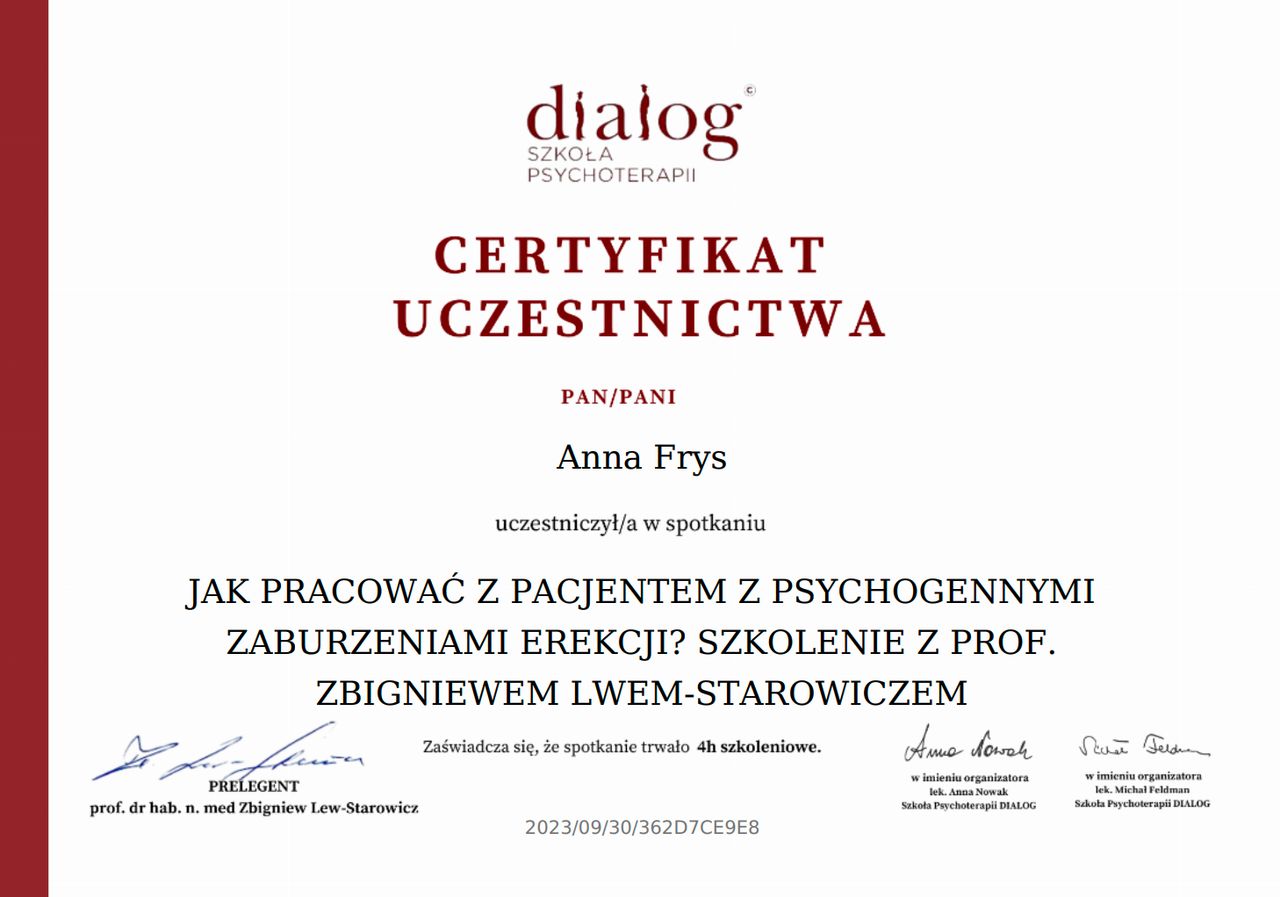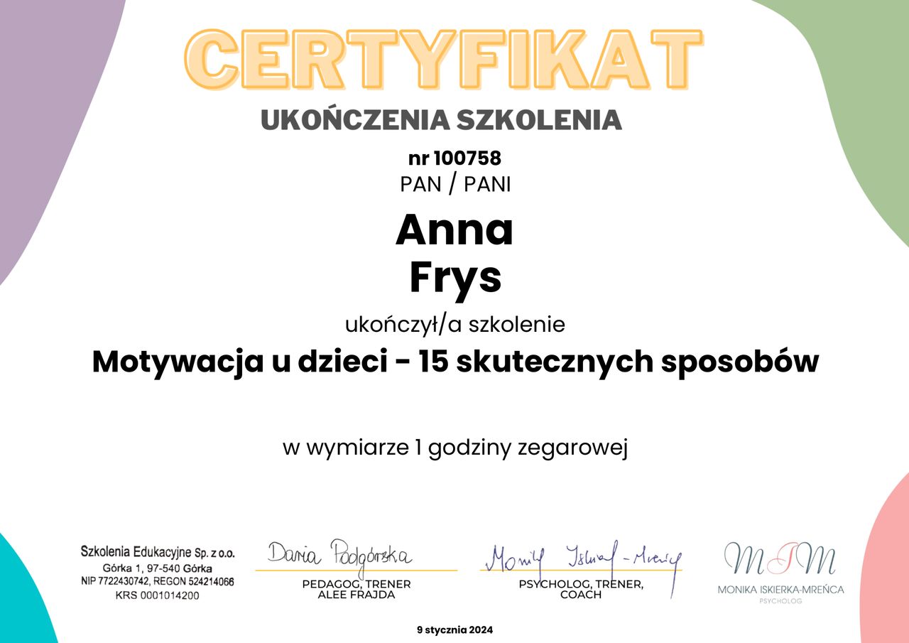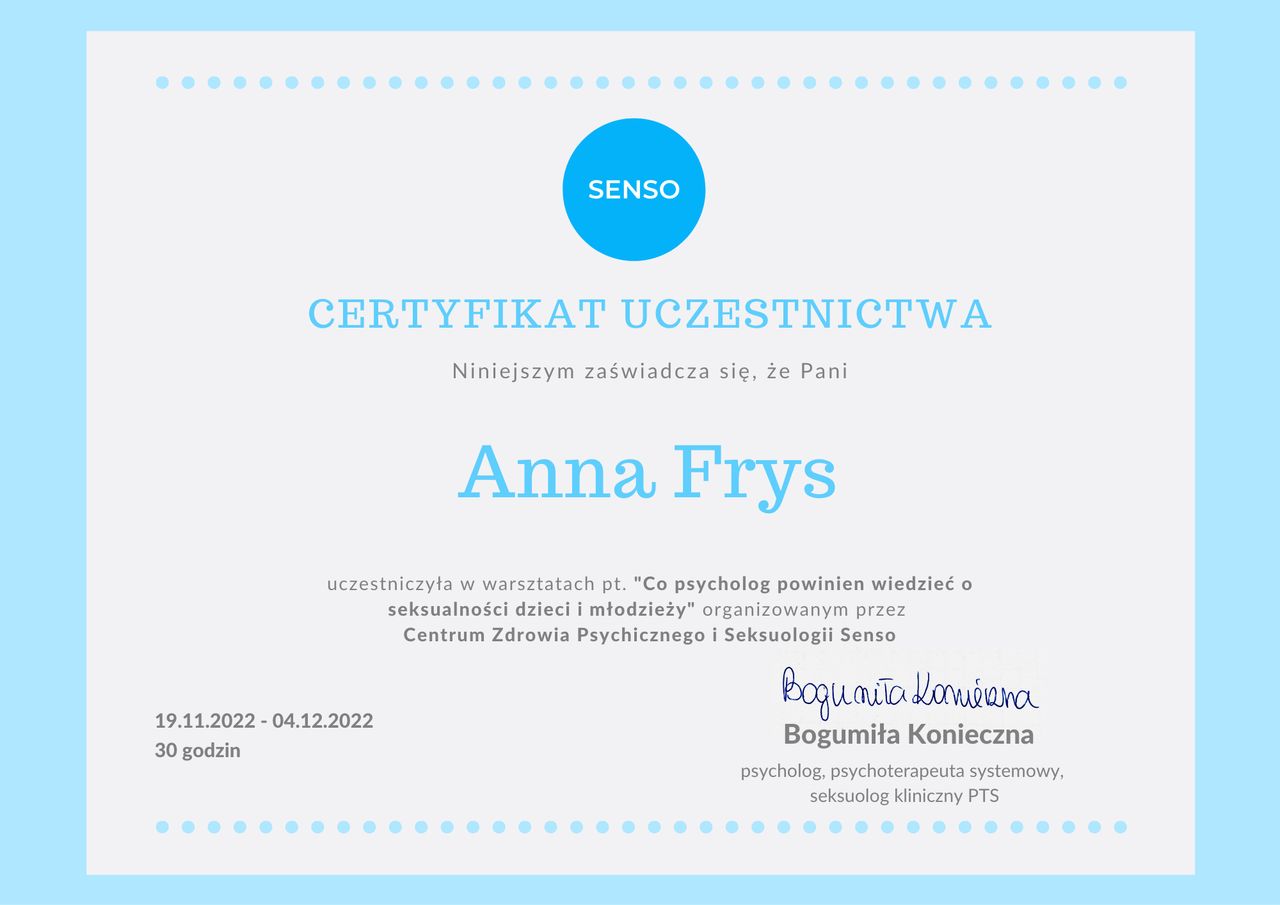 Czy Anna Frys przyjmuje online, bez konieczności pojawiania się w placówce?Tak, Anna Frys oferuje konsultacje online. Wybierz opcję „konsultacja online” przy umawianiu wizyty, a zobaczysz dostępne terminy.