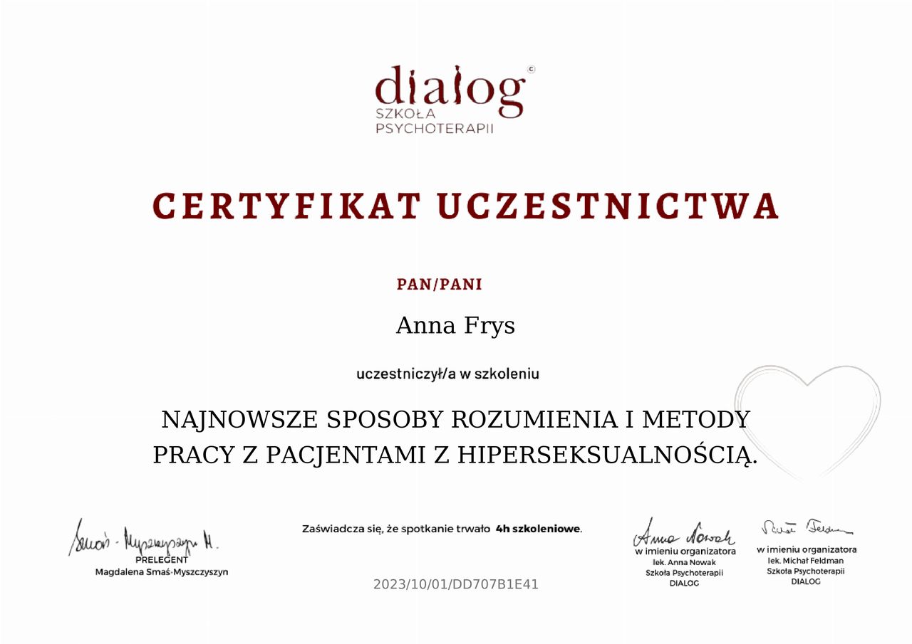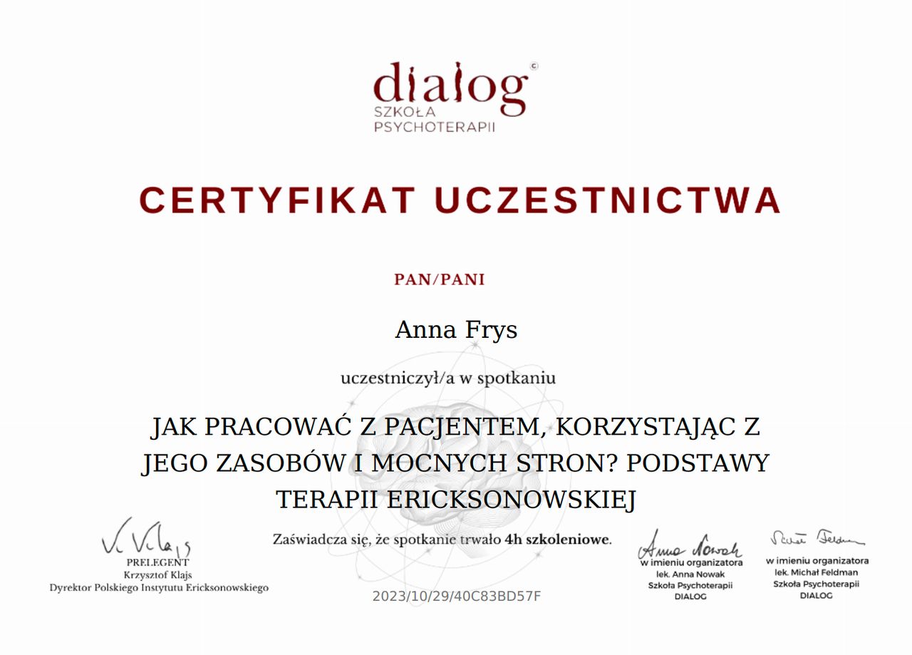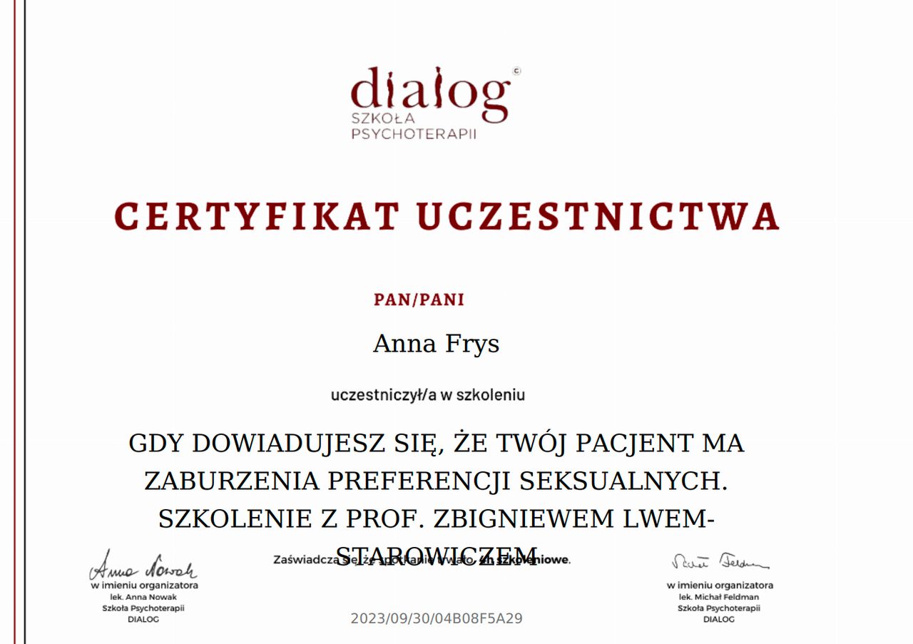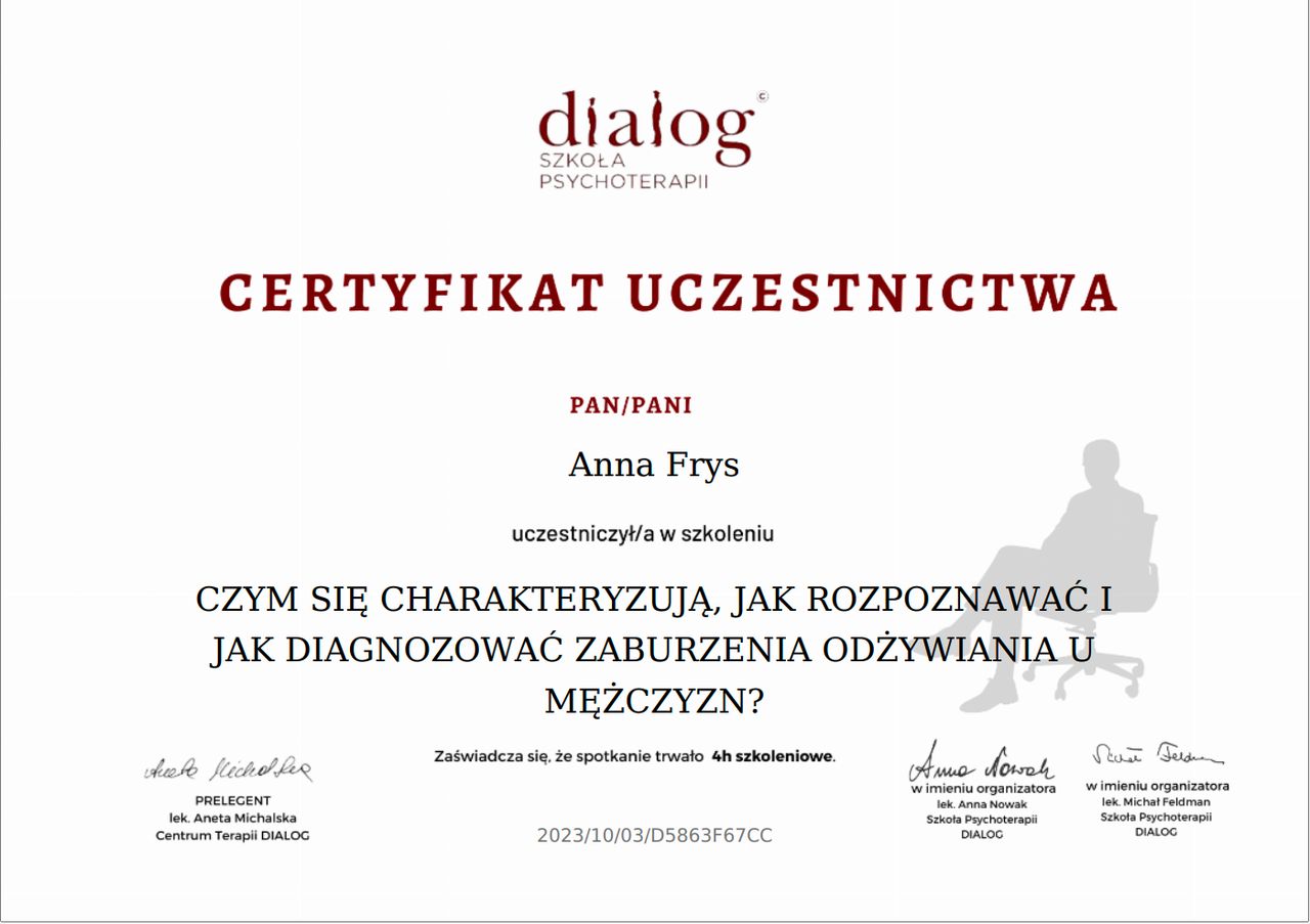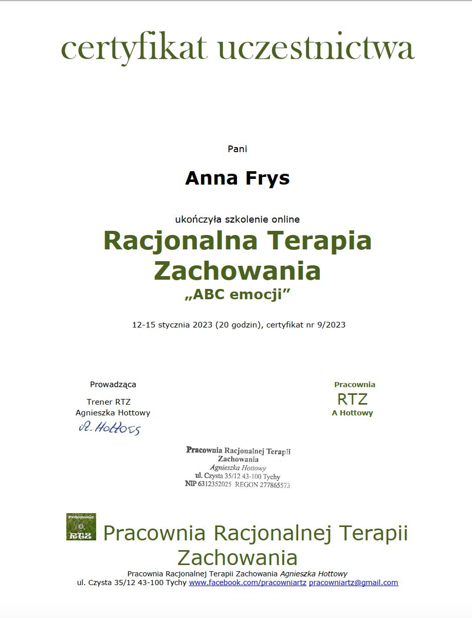 Czy Anna Frys przyjmuje online, bez konieczności pojawiania się w placówce?Tak, Anna Frys oferuje konsultacje online. Wybierz opcję „konsultacja online” przy umawianiu wizyty, a zobaczysz dostępne terminy.