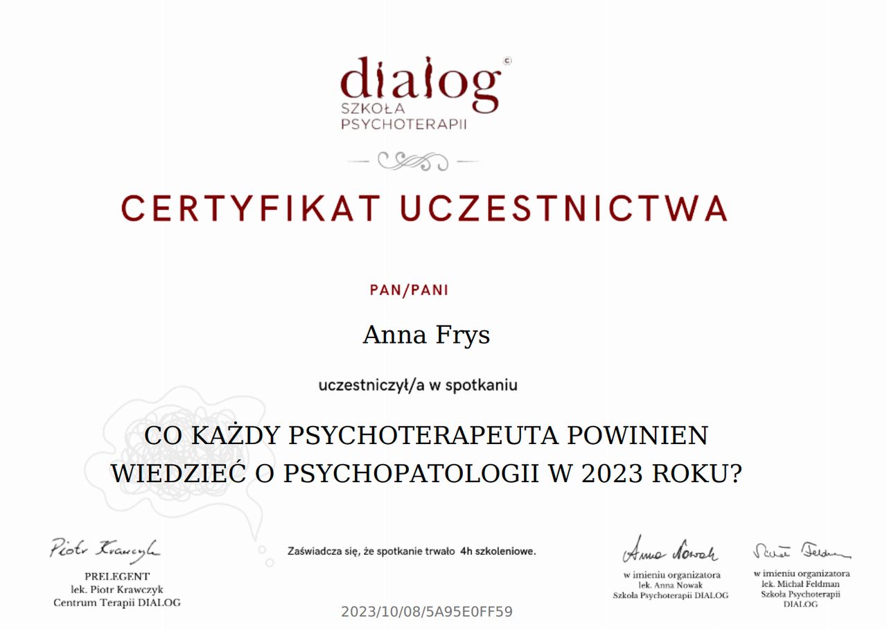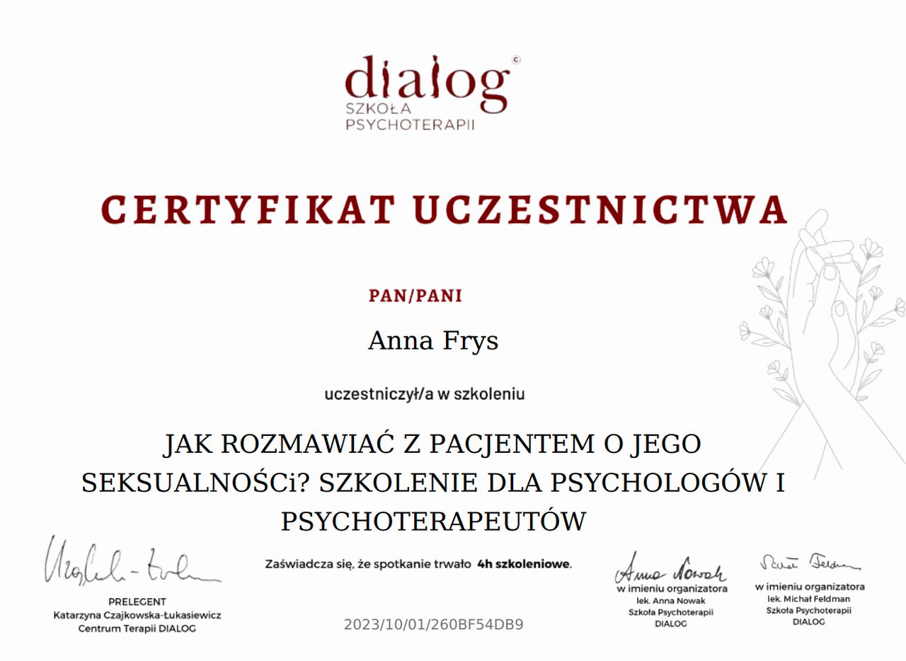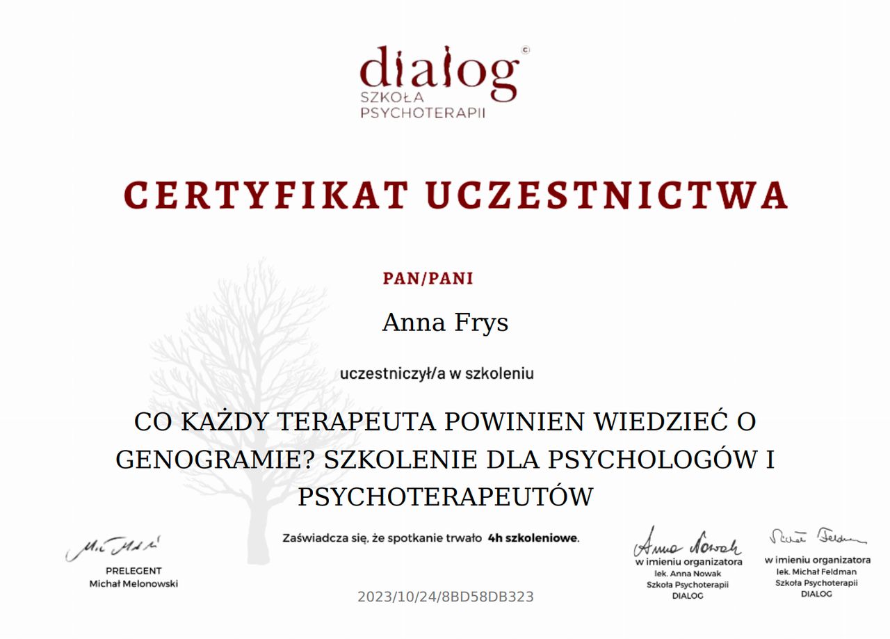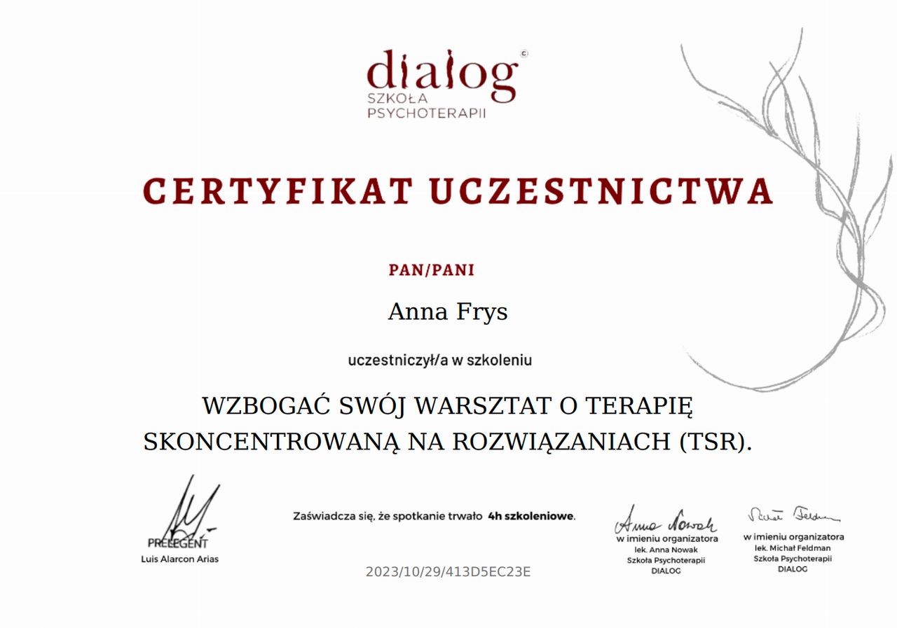 Czy Anna Frys przyjmuje online, bez konieczności pojawiania się w placówce?Tak, Anna Frys oferuje konsultacje online. Wybierz opcję „konsultacja online” przy umawianiu wizyty, a zobaczysz dostępne terminy.