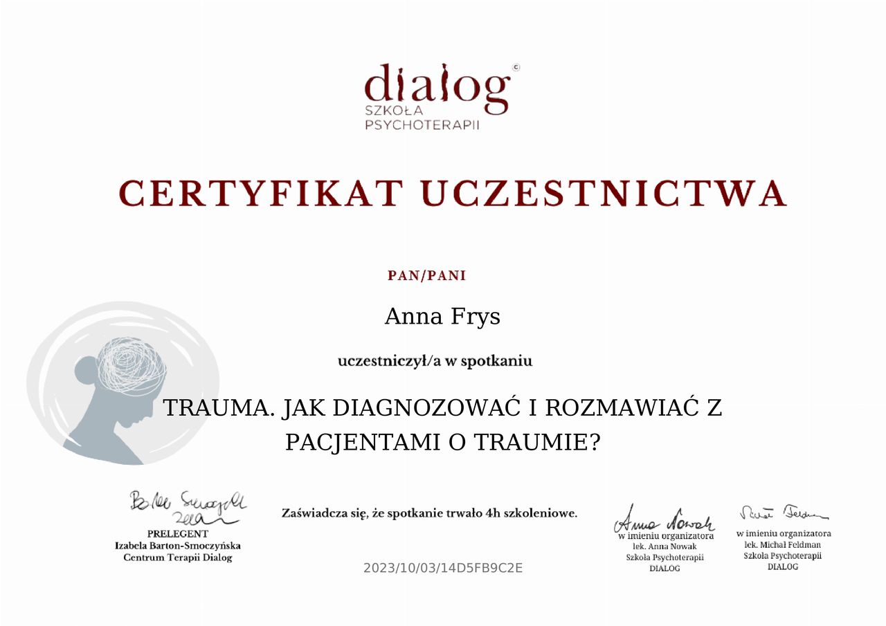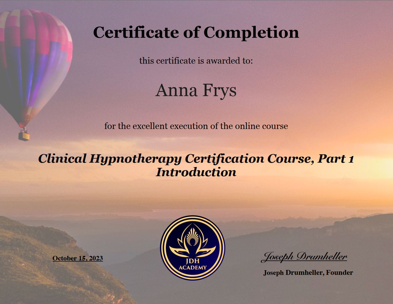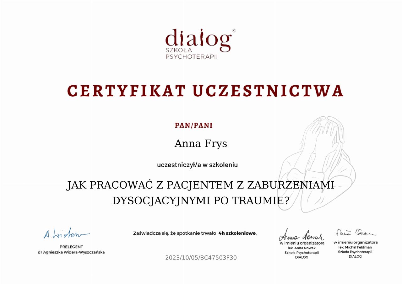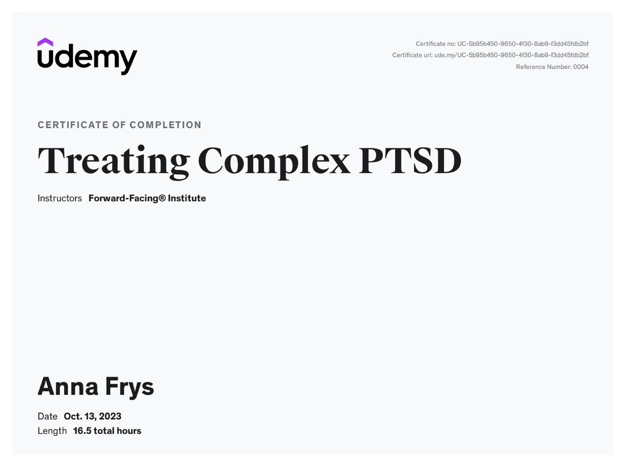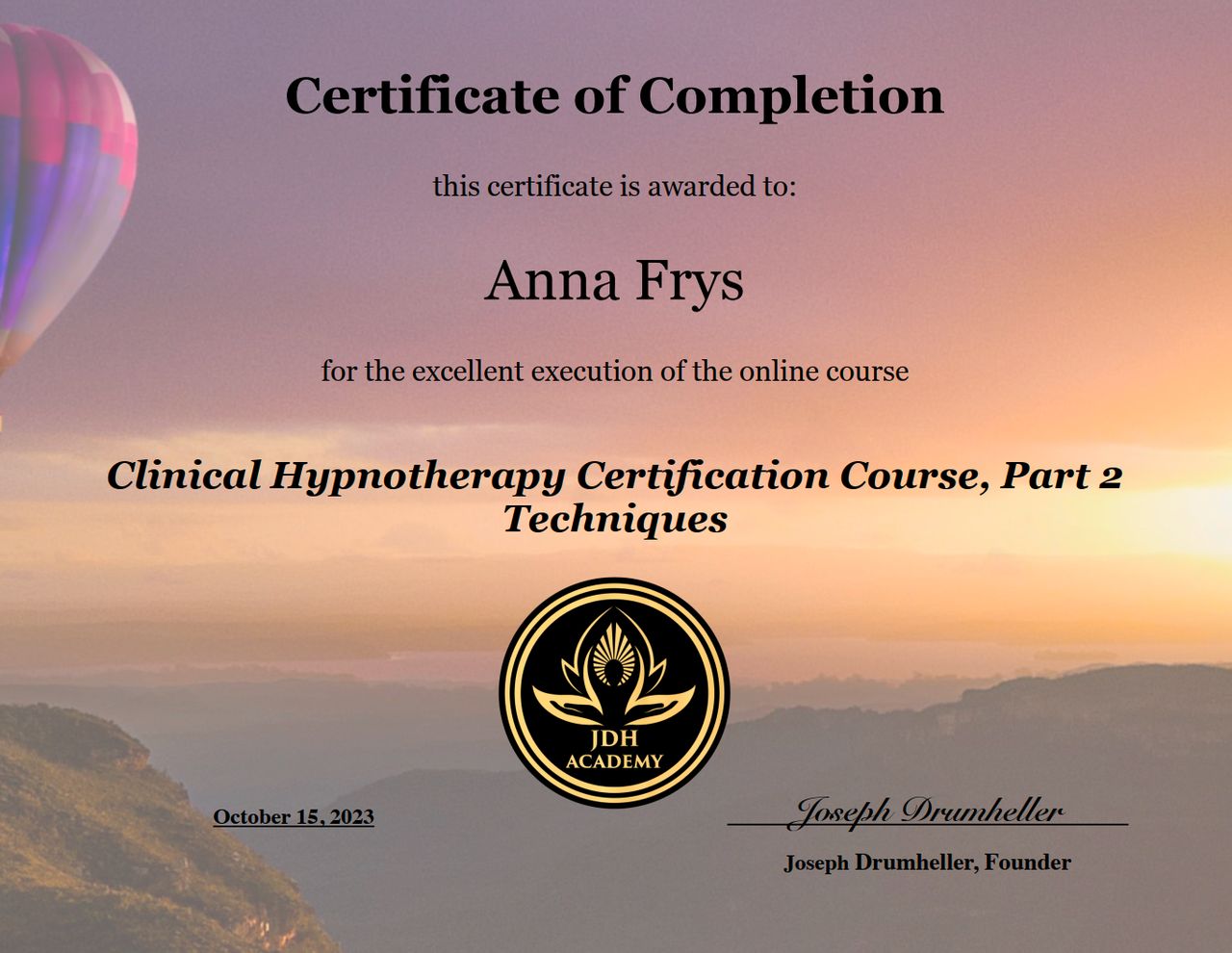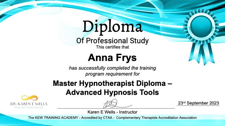 W ramach swojej praktyki zajmuję się leczeniem traum (PTT EMDR Polska, Warszawa) oraz hipnoterapia (The American Hypnosis Association, Los Angeles).