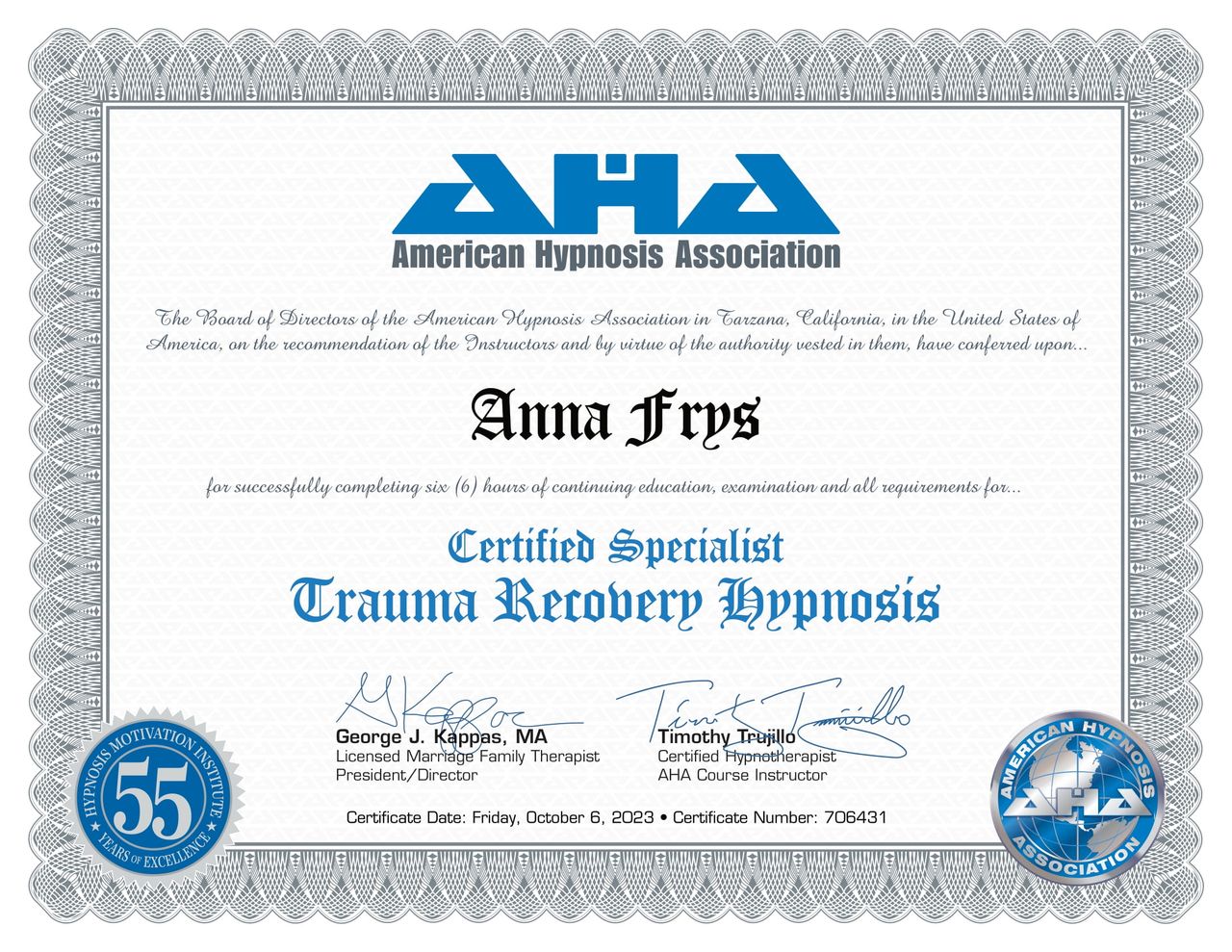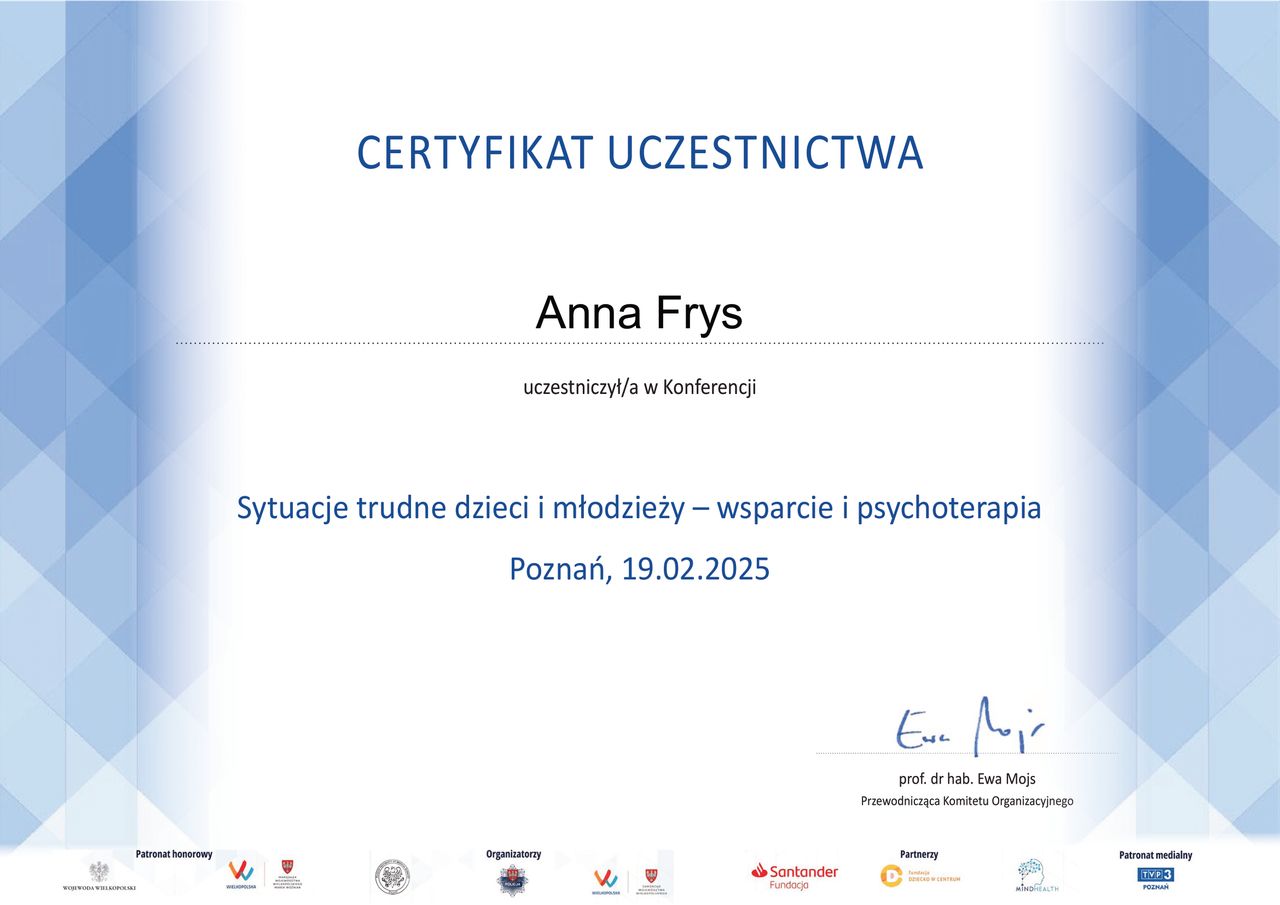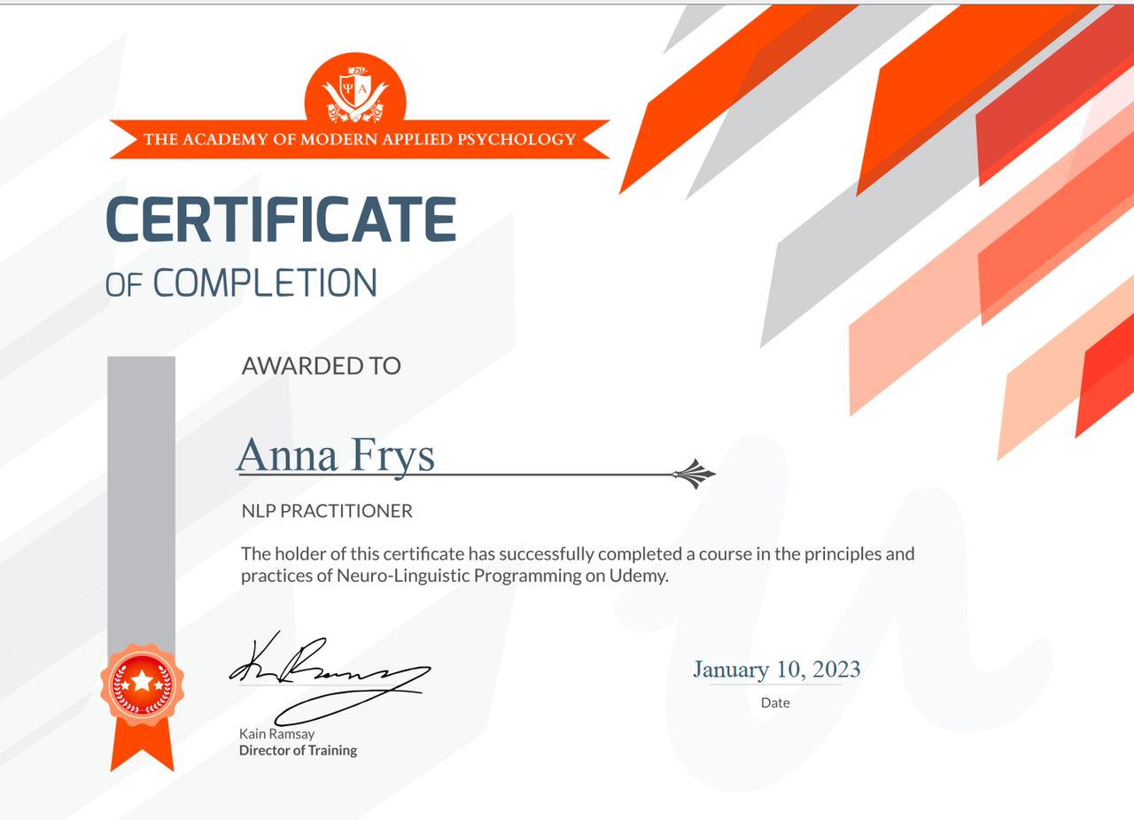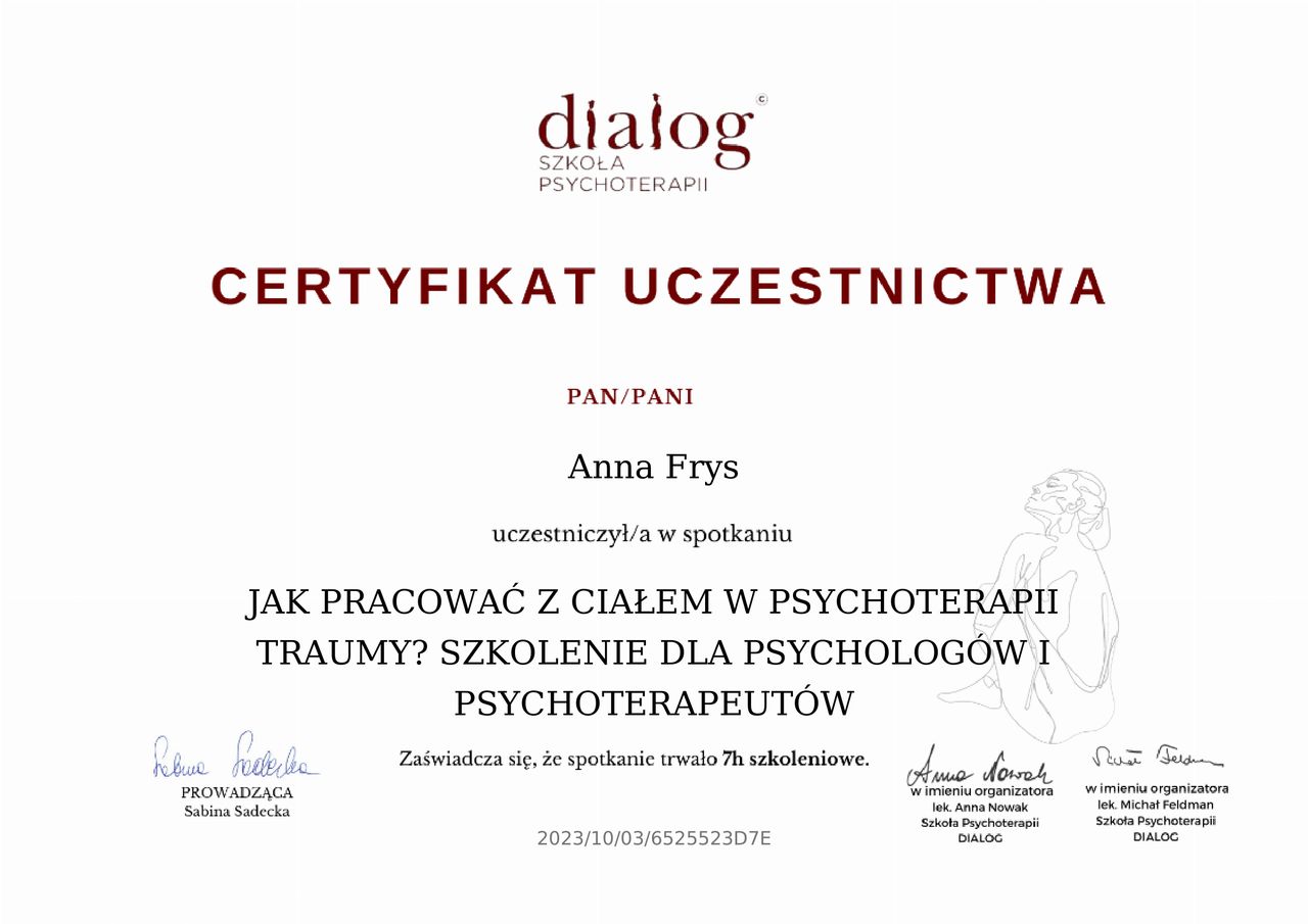 W ramach swojej praktyki zajmuję się leczeniem traum (PTT EMDR Polska, Warszawa) oraz hipnoterapia (The American Hypnosis Association, Los Angeles).