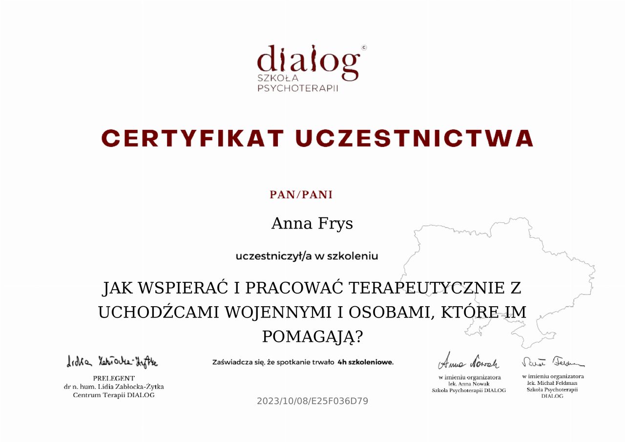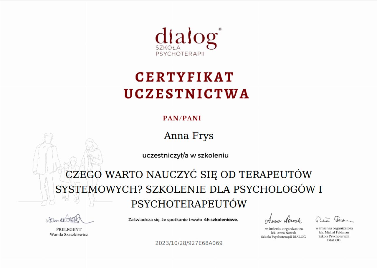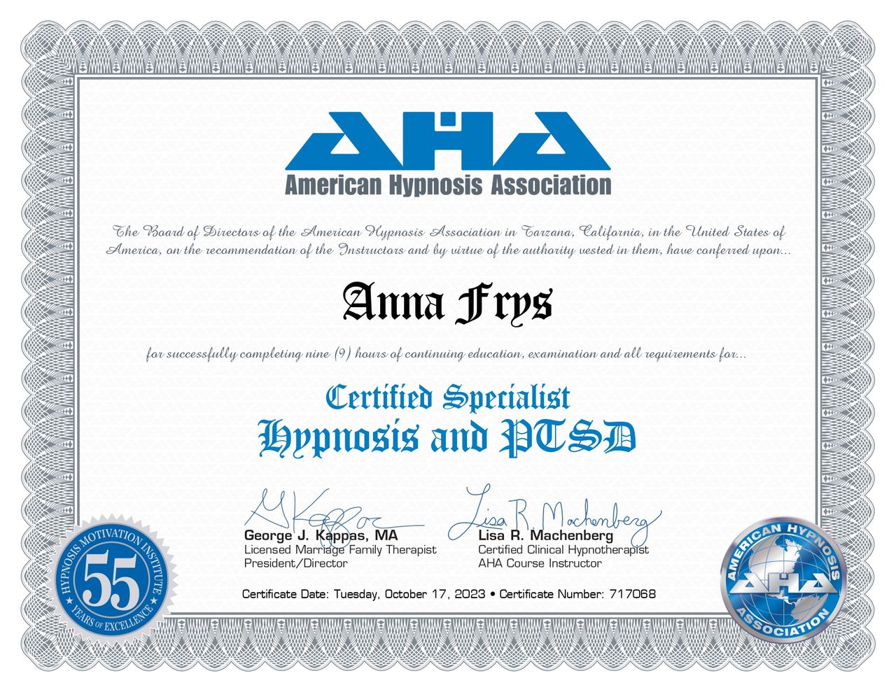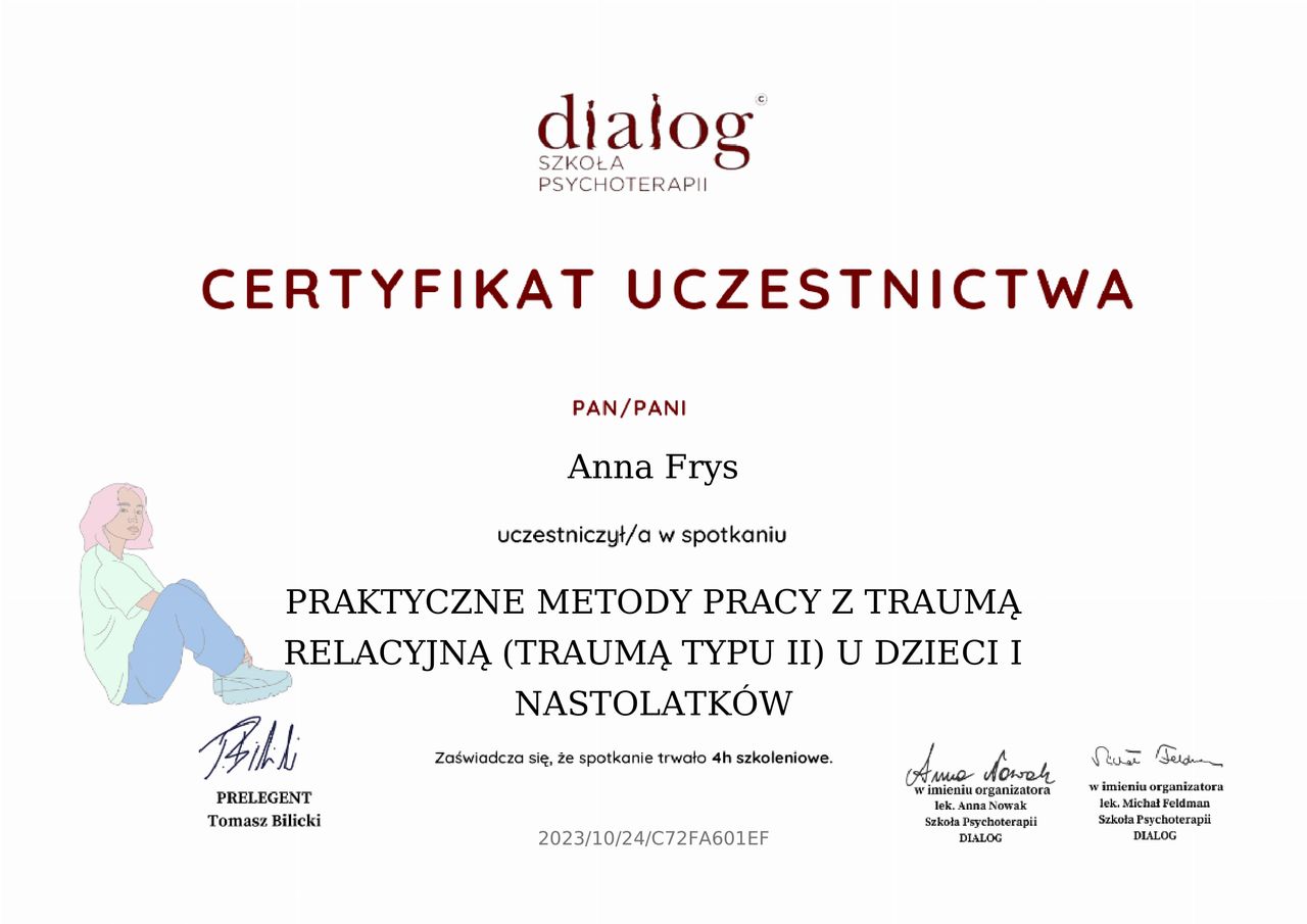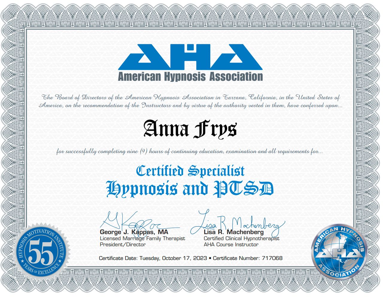 W ramach swojej praktyki zajmuję się leczeniem traum (PTT EMDR Polska, Warszawa) oraz hipnoterapia (The American Hypnosis Association, Los Angeles).