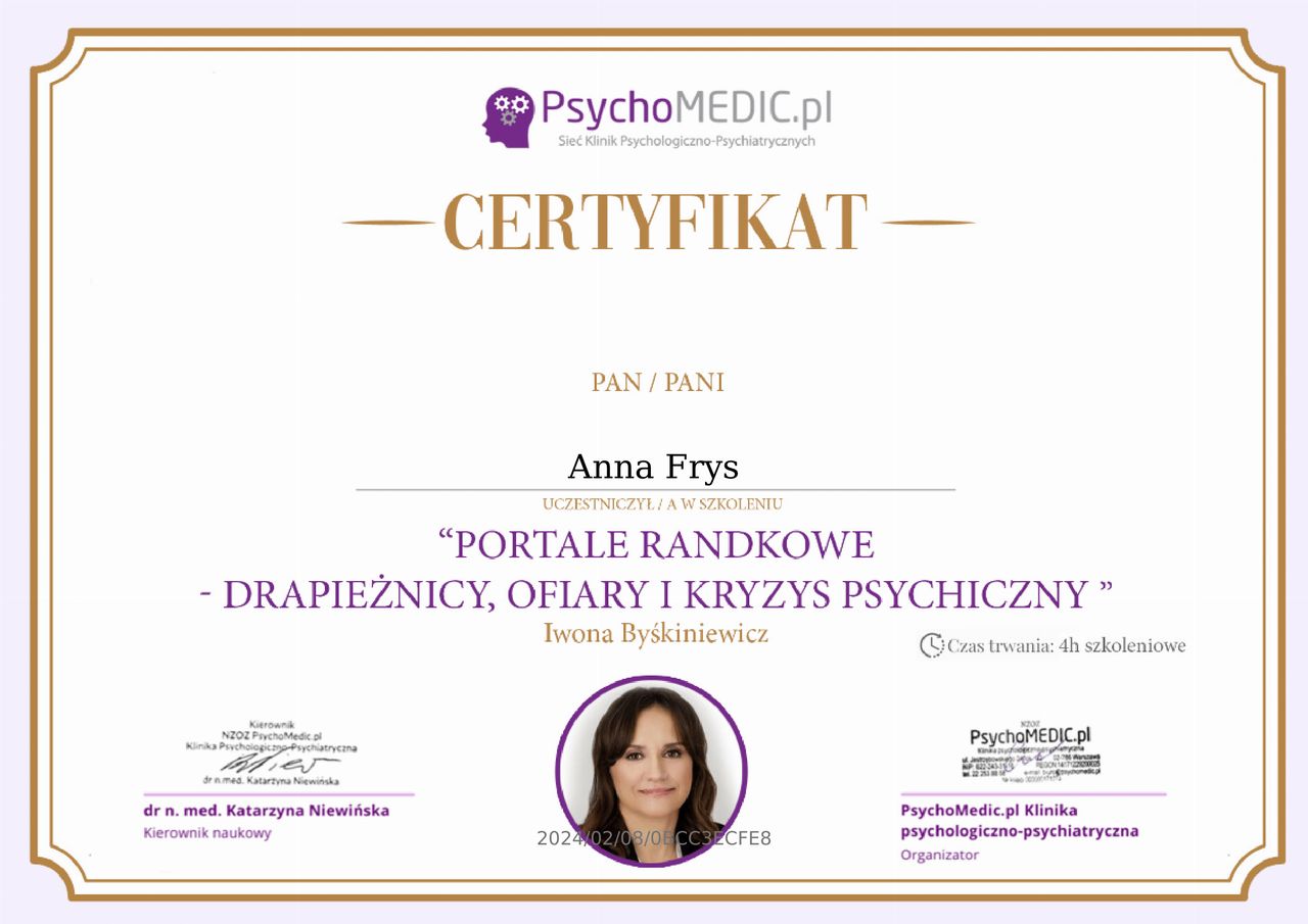 Jaki jest zakres porad oferowanych przez Anna Frys?Anna Frys to psycholog, psychotraumatolog. Na podstawie swojego doświadczenia i wykształcenia Anna Frys oferuje usługi takie jak: hipnoza, Konsultacja psychologiczna, testy osobowości, konsultacja psychoterapeutyczna, Terapia EMDR, Arteterapia, konsultacja psychotraumatologiczna, hipnoterapia, Konsultacja online (weekend, święta), Konsultacja psychologiczna dla dzieci i młodzieży.