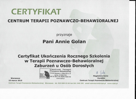 Właśnie zakończyłem u p. Anny Golan półroczną terapię PTSD. Problem, z którym zmagałem się od lat, został rozwiązany.