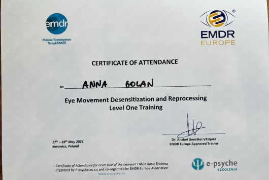 Mam ogromną wdzięczność za to, że mogę z nią pracować. To doskonały psycholog, któremu zawdzięczam bardzo wiele."• Gabinet Terapeutyczny Anny Golan • terapia PTSD metodą EMDR •