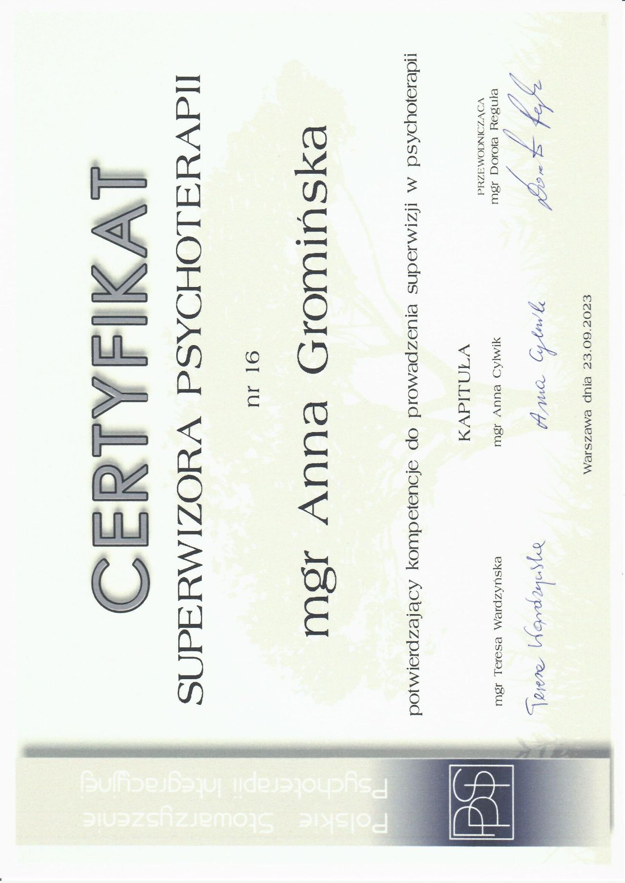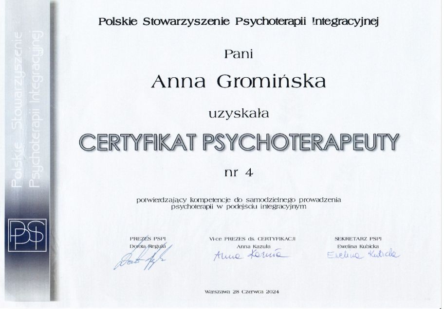 Ukończyłam 4,5 letnie podyplomowe szkolenie w Profesjonalnej Szkole Psychoterapii prowadzone przez Instytut Psychologii Zdrowia PTP oraz Szkołę Wyższą Psychologii Społecznej w Warszawie. Swoje kwalifikacje w zakresie prowadzenia terapii doskonaliłam także w ramach dwuletniego kształcenia w zakresie psychoterapii systemowej indywidualnej i rodzinnej prowadzonego przez Wielkopolskie Towarzystwo Terapii Systemowej, rocznego Kursu terapii par w Laboratorium Psychoedukacji, zaawansowanego trzystopniowego szkolenia w zakresie prowadzenia terapii skoncentrowanej na emocjach (EFT) akredytowanego przez ICEEFT w Kanadzie oraz licznych szkoleniach doskonalących umiejętności psychoterapeuty zorganizowanych przez Polski Instytut Ericksonowski, Polskie Stowarzyszenie Psychoterapii Integracyjnej oraz Instytut Terapii Gestalt.
