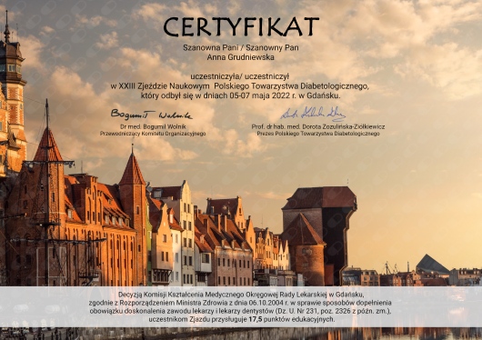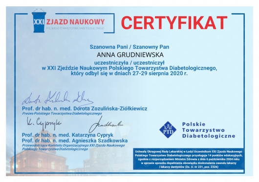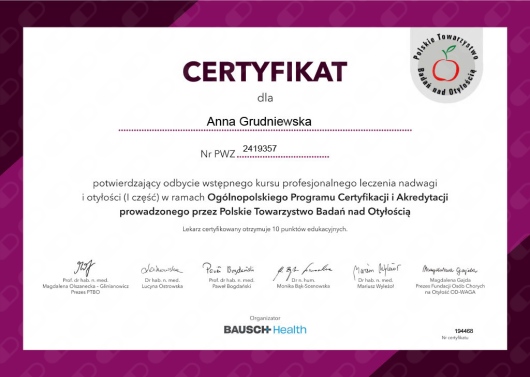 Posiada certyfikat profesjonalnego leczenia nadwagi i otyłości Polskiego Towarzystwa Badań nad Otyłością.