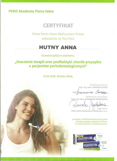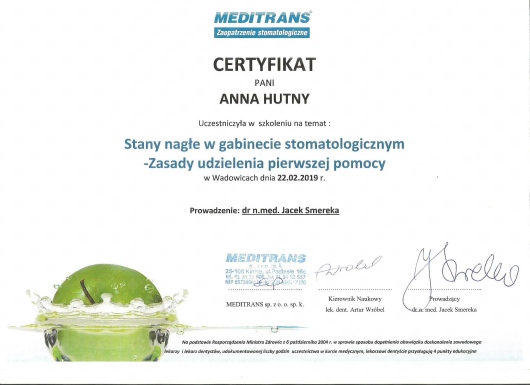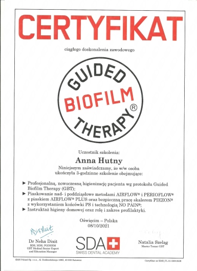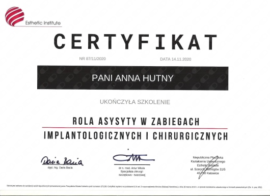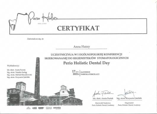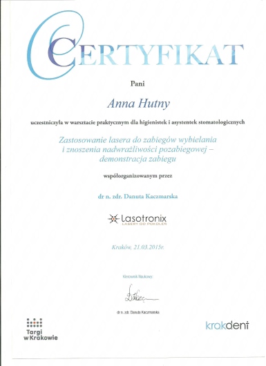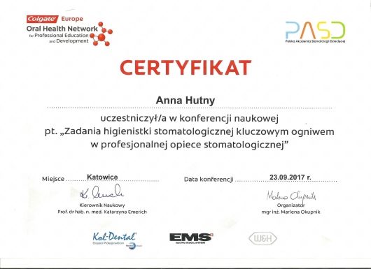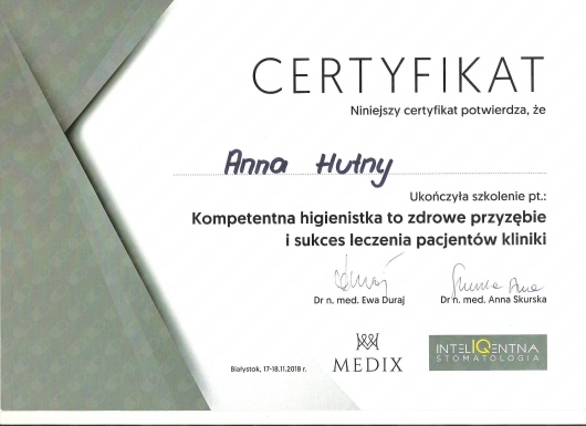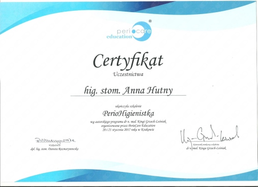 Moja specjalność: profesjonalna higienizacja jamy ustnej i wybielanie. W Centrum Uśmiechnij Mi Się wykonuję zabiegi higienizacyjne, instruktaże higieny jamy ustnej oraz zabiegi profilaktyczne. Zajmuję się również wybielaniem zębów i regeneracją szkliwa z użyciem systemu PREVDENT. Nieustanie podnoszę swoje kwalifikacje uczestnicząc w kursach i szkoleniach dotyczących najnowszych trendów w dziedzinie profesjonalnej higienizacji i asysty implantologicznej. Od kilku lat dzielę się swoją wiedzą i doświadczeniem jako wykładowca w szkole dla asystentek i higienistek stomatologicznych. Zapraszam moich stałych jak i nowych Pacjentów do zapisów na wizyty.