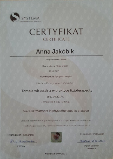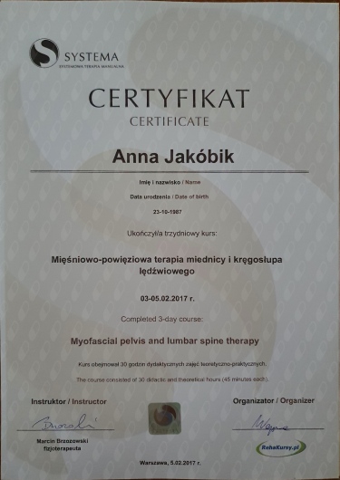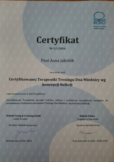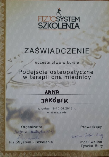 Jaki jest zakres porad oferowanych przez Anna Jakóbik?Anna Jakóbik to fizjoterapeuta. Na podstawie swojego doświadczenia i wykształcenia Anna Jakóbik oferuje usługi takie jak: konsultacja fizjoterapeutyczna, fizjoterapia kobiet w ciąży / fizjoterapia okołoporodowa, fizjoterapia uroginekologiczna, fizjoterapia dna miednicy.