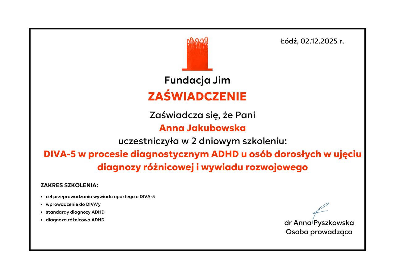 Jestem psychologiem o specjalności klinicznej i członkiem nadzwyczajnym Wielkopolskiego Towarzystwa Terapii Systemowej, gdzie zdobywałam umiejętności terapeutyczne i poszerzałam swoją wiedzę w tym zakresie. Ukończyłam również I stopień Terapii Krótkoterminowej Skoncentrowanej na Rozwiązaniu, a także roczny kurs Terapii Poznawczo-Behawioralnej. W ostatnim czasie uczestniczyłam w szkoleniu dotyczącym procesu diagnostycznego ADHD u osób dorosłych. Dbam o stałe podnoszenie jakości świadczonych usług poprzez systematyczne rozszerzanie repartuaru narzędzi i technik diagnostycznych oraz terapeutycznych.