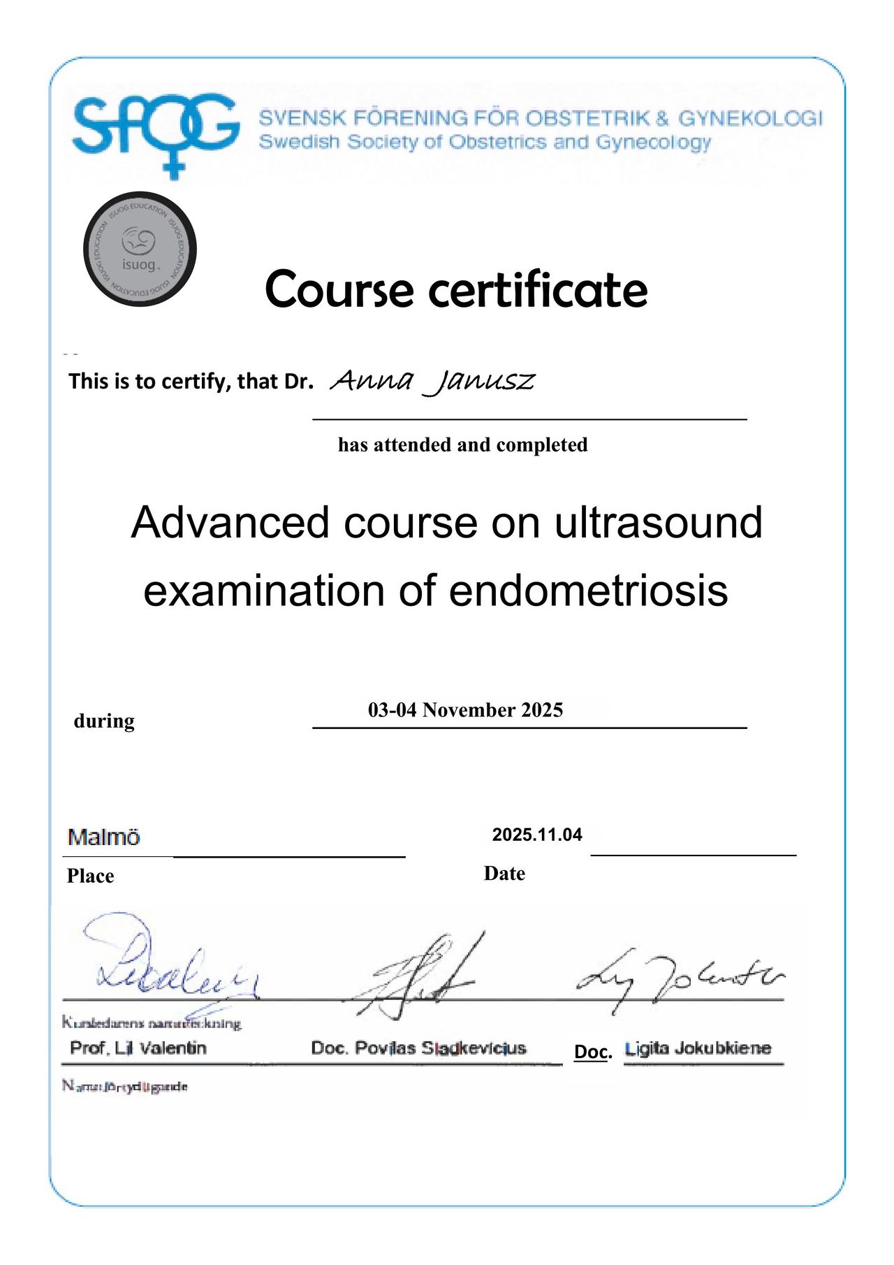 - Certyfikat Sekcji Ultrasonografii PTGiP w zakresie wykonywania badań ultrasonograficznych w położnictwie i ginekologii