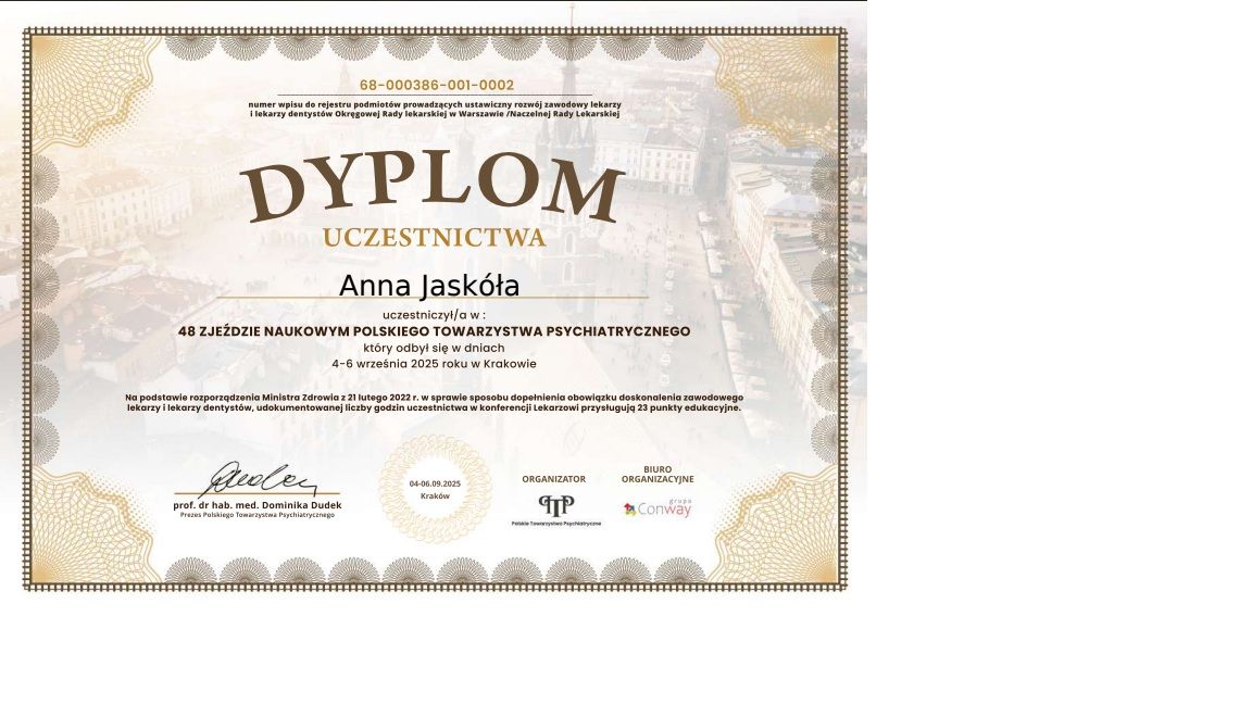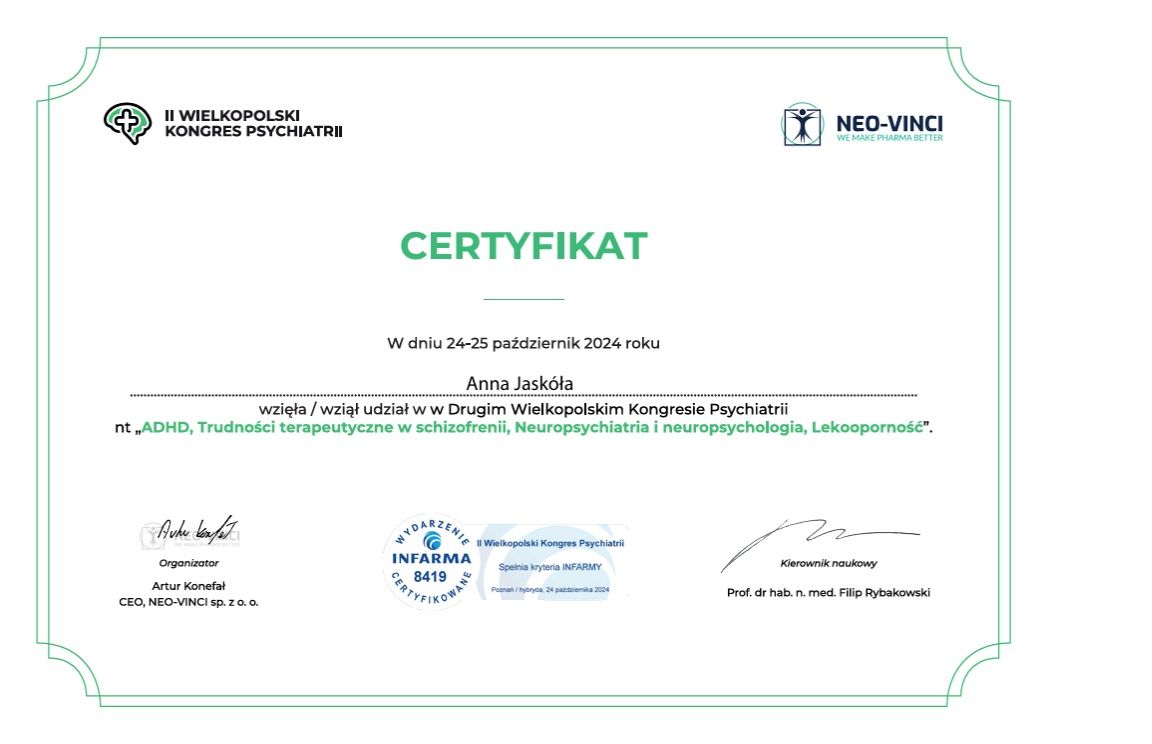 Widać, że traktuje swoją pracę jak misję – łączy profesjonalizm z ciepłym, ludzkim podejściem. Jej rzetelność i autentyczna troska o pacjenta sprawiają, że czuje się on naprawdę ważny i wysłuchany. Z pełnym przekonaniem mogę stwierdzić, że to lekarz o wysokich kompetencjach i wyjątkowej kulturze osobistej. Zdecydowanie polecam każdemu, kto szuka specjalisty, który naprawdę chce pomóc i potrafi stworzyć przyjazną, bezpieczną atmosferę.• Synapsis Med • konsultacja psychiatryczna (pierwsza wizyta) •