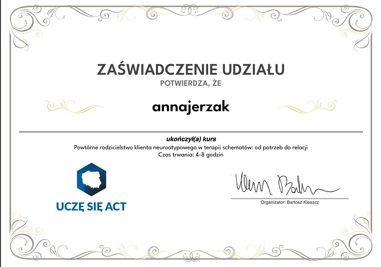Obecnie rozwijam swoje kompetencje w zakresie terapii schematów – ukończyłam kurs przygotowujący do certyfikatu International Society of Schema Therapy (ISST) i realizuję wymaganą superwizję. Regularnie uczestniczę w szkoleniach specjalistycznych, a swoją pracę poddaję stałej superwizji indywidualnej i grupowej.