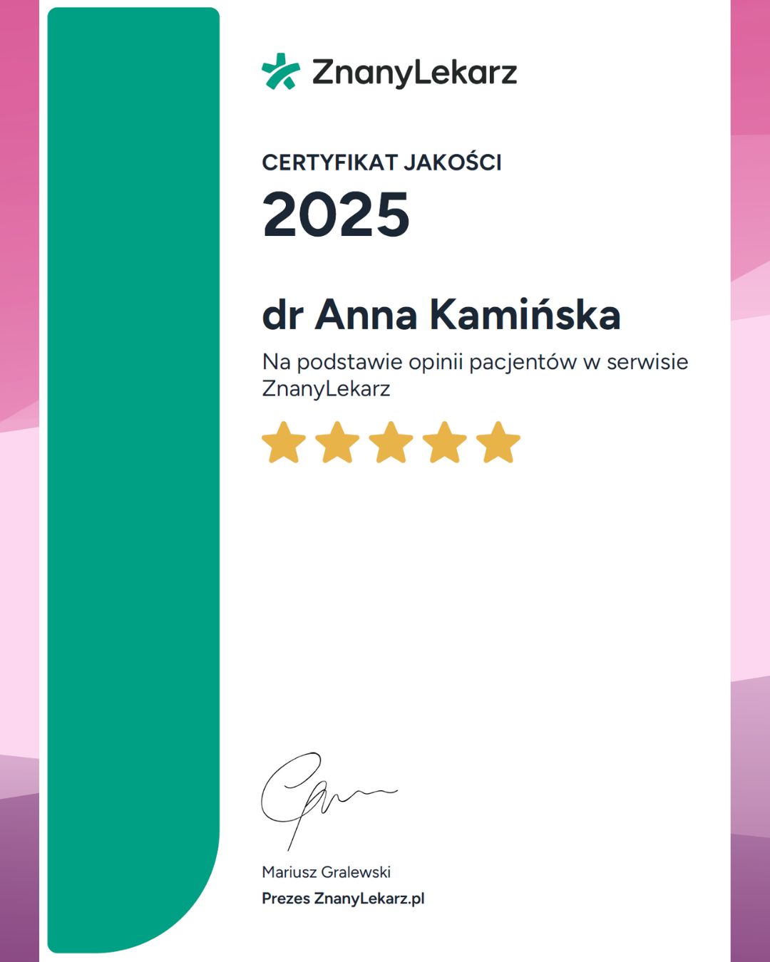 Serdecznie polecam Panią doktor. Jako młoda, 23-letnia kobieta mam wiele wątpliwości i obaw, ale Pani Anna jest niesamowicie cierpliwą, ciepłą osobą z ogromną wiedzą i zaangażowaniem. To zdecydowanie moje najlepsze doświadczenie wizyty u ginekologa, a miałam ich już sporo. Wizyta przebiegła bez żadnego pośpiechu, mimo, że zdecydowanie się przedłużyła - Pani Anna chciała “rozwiać” moje wszelkie wątpliwości bez patrzenia na zegarek. Czuję się spokojna oraz pełna nadziei, a także zdumiona moją dzisiejszą wizytą! Polecam i bardzo dziękuję, Pani doktor!